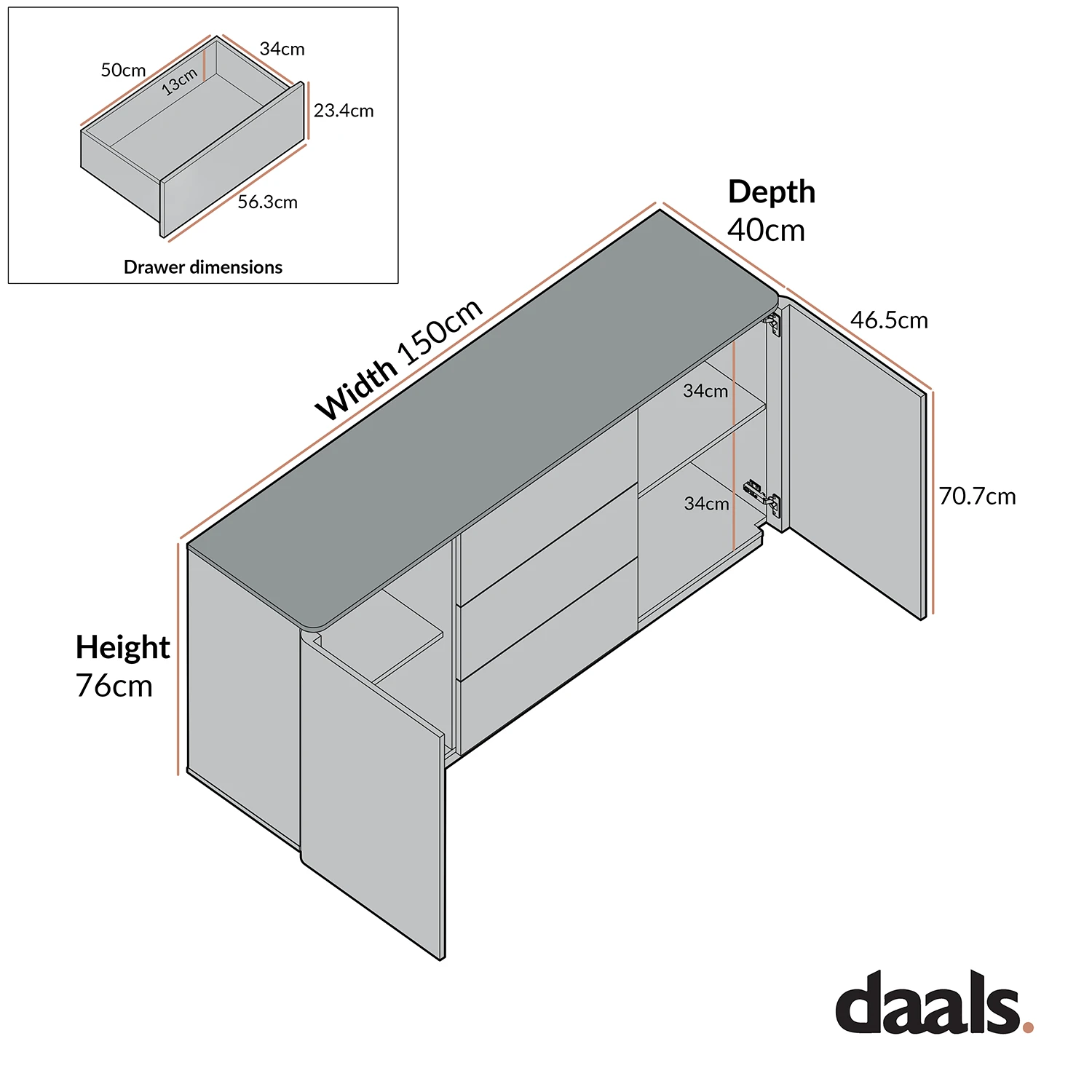 - The sideboard features 2 push to open cabinet doors 3 drawers, offering ample storage space inside.