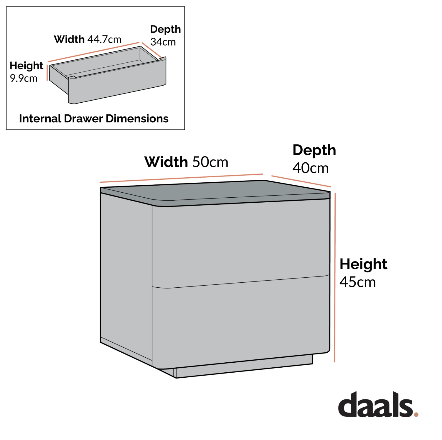 - Drawer internal storage space: W 41.7 x H 16 x D 34 cm