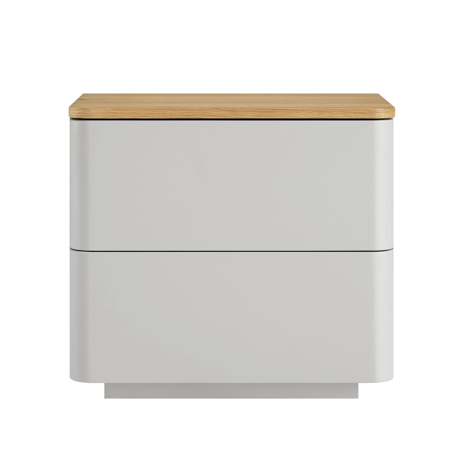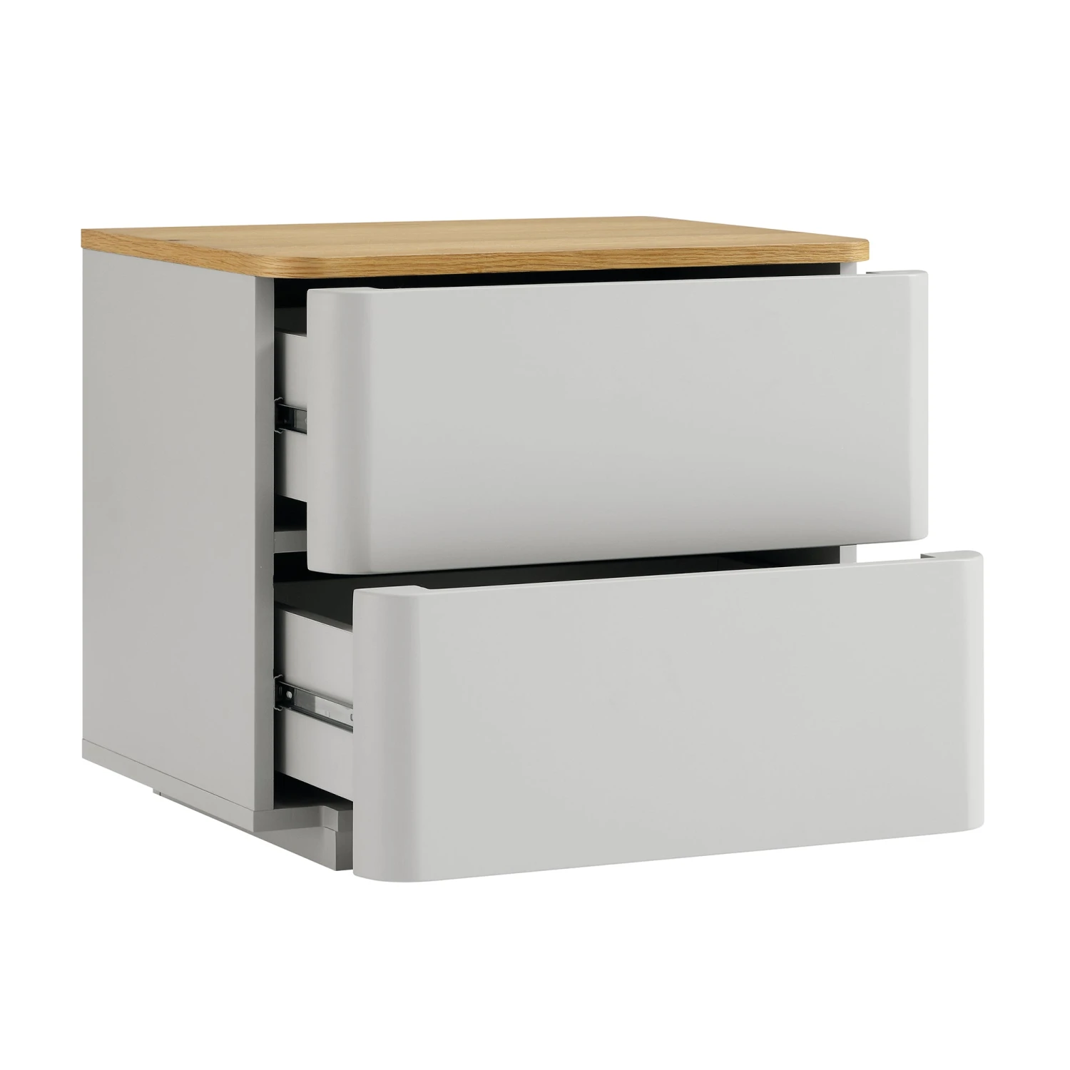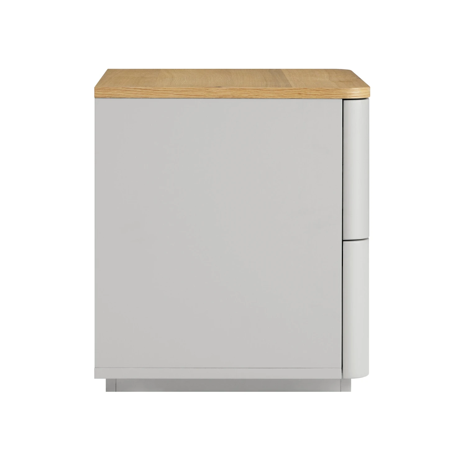 - The bedside table features solid oak veneer top contrasted with matte dove grey frame and drawers.