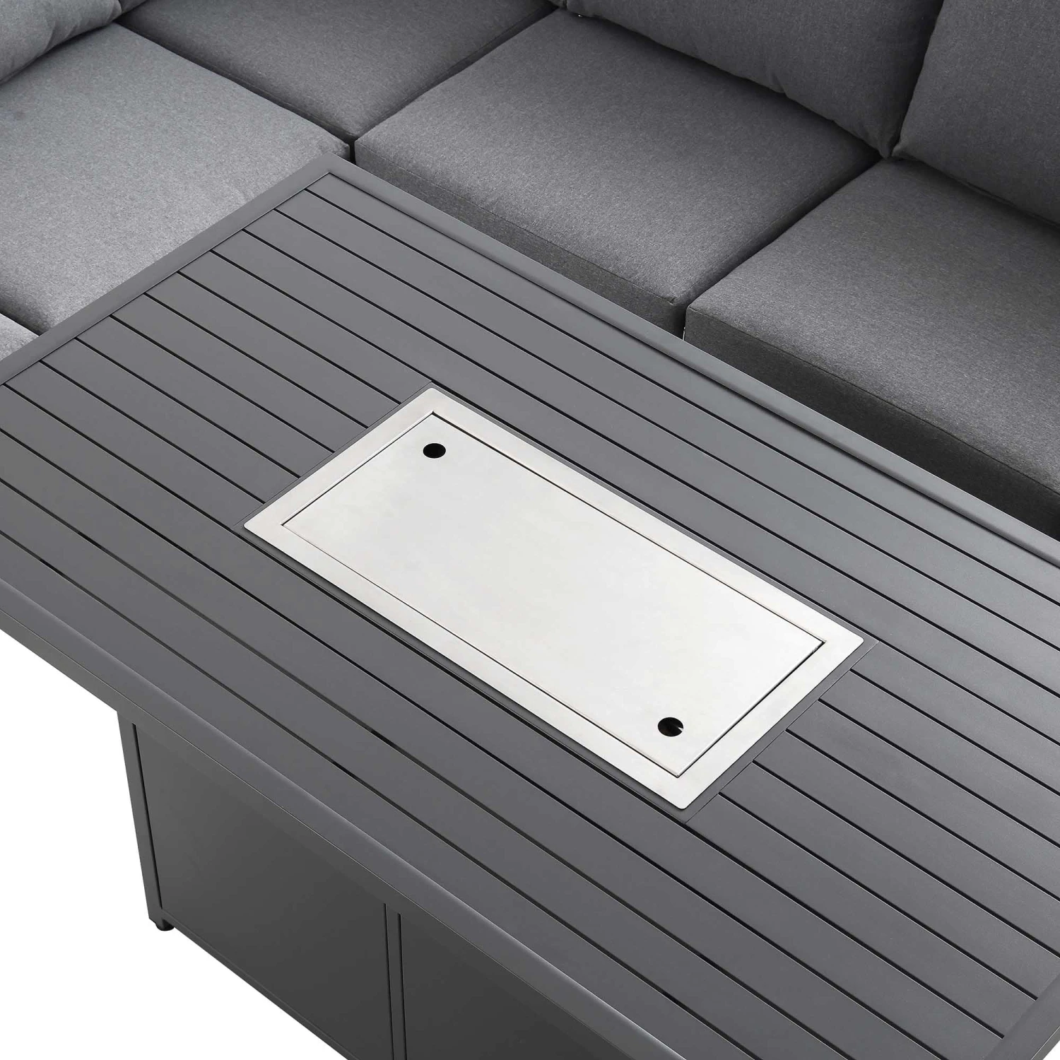 - Comprising of a solid aluminium frame and sumptuous back and seat cushions for added comfort and support, our Albany Large Corner Casual Dining Set with firepit table is perfect for outdoor gatherings