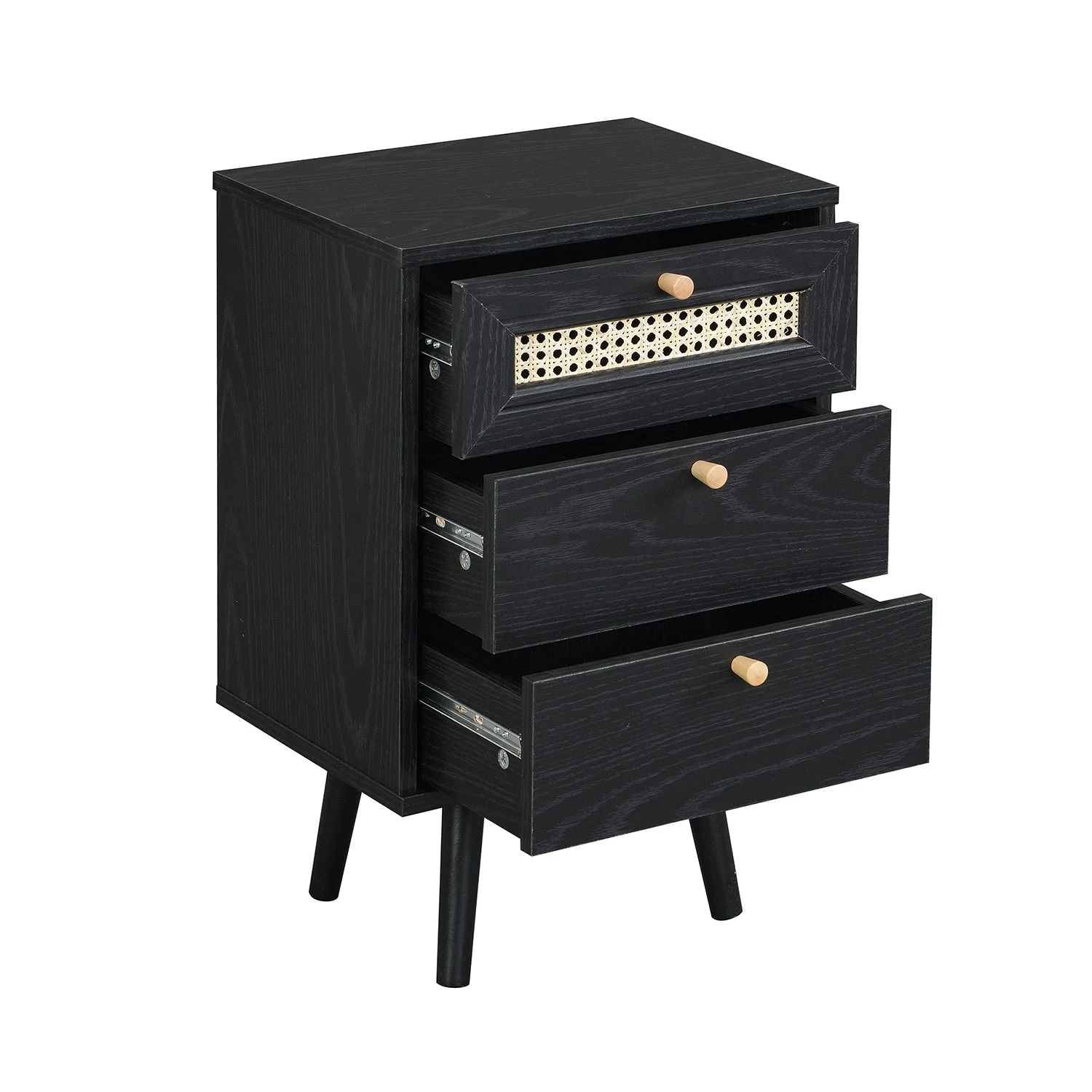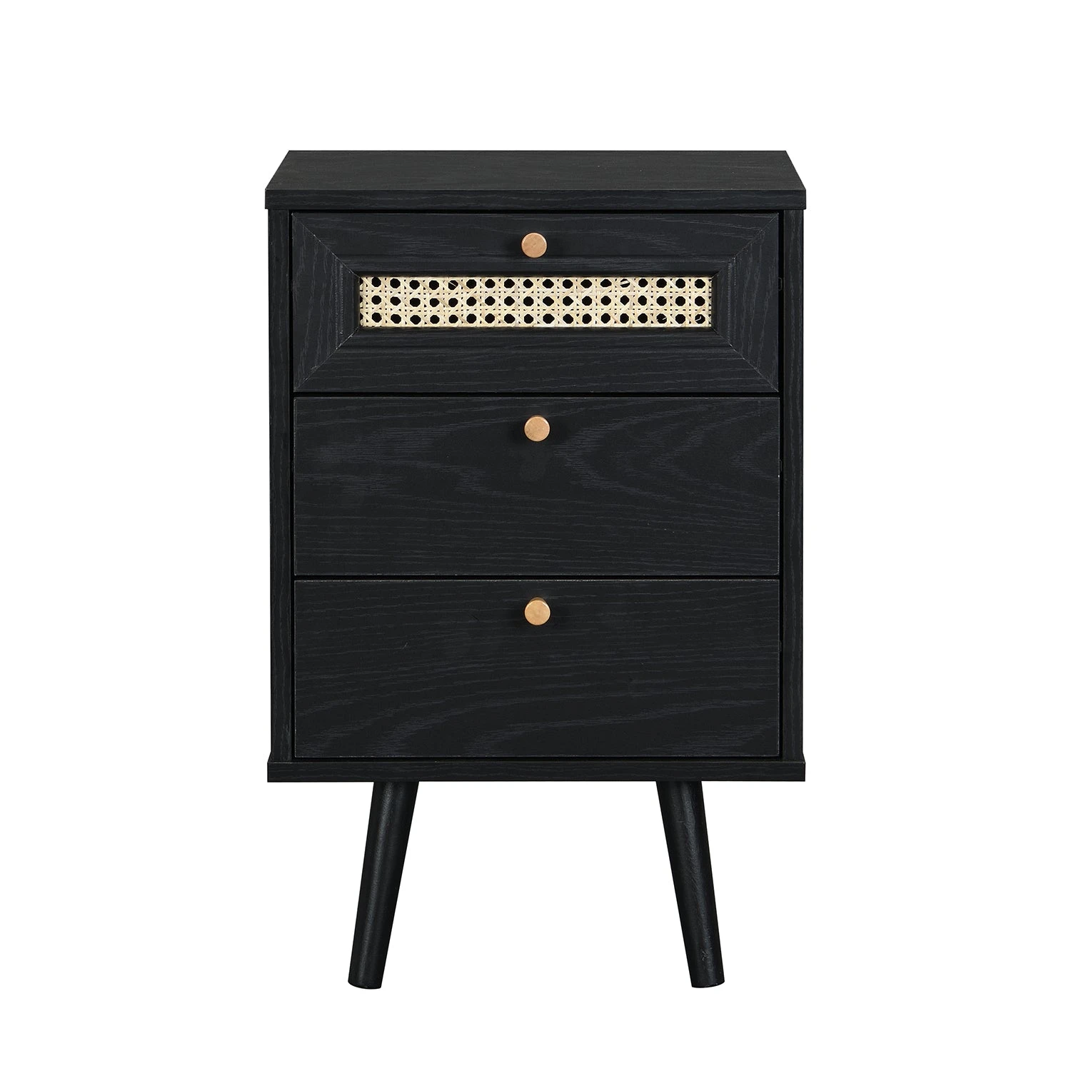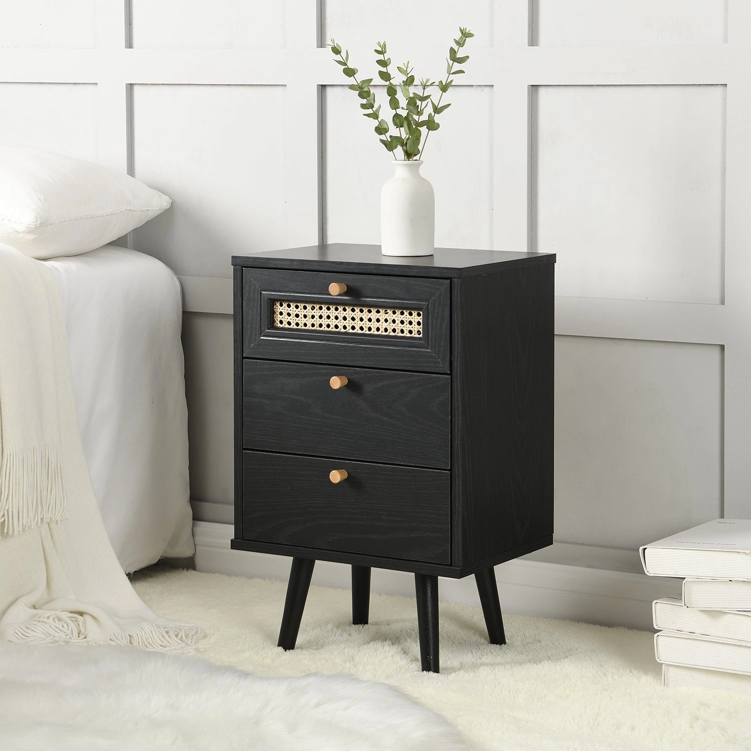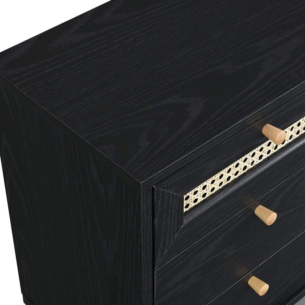 - Our Anya bedside table is designed with beautiful natural woven rattan drawer door and solid wood drawer handles.