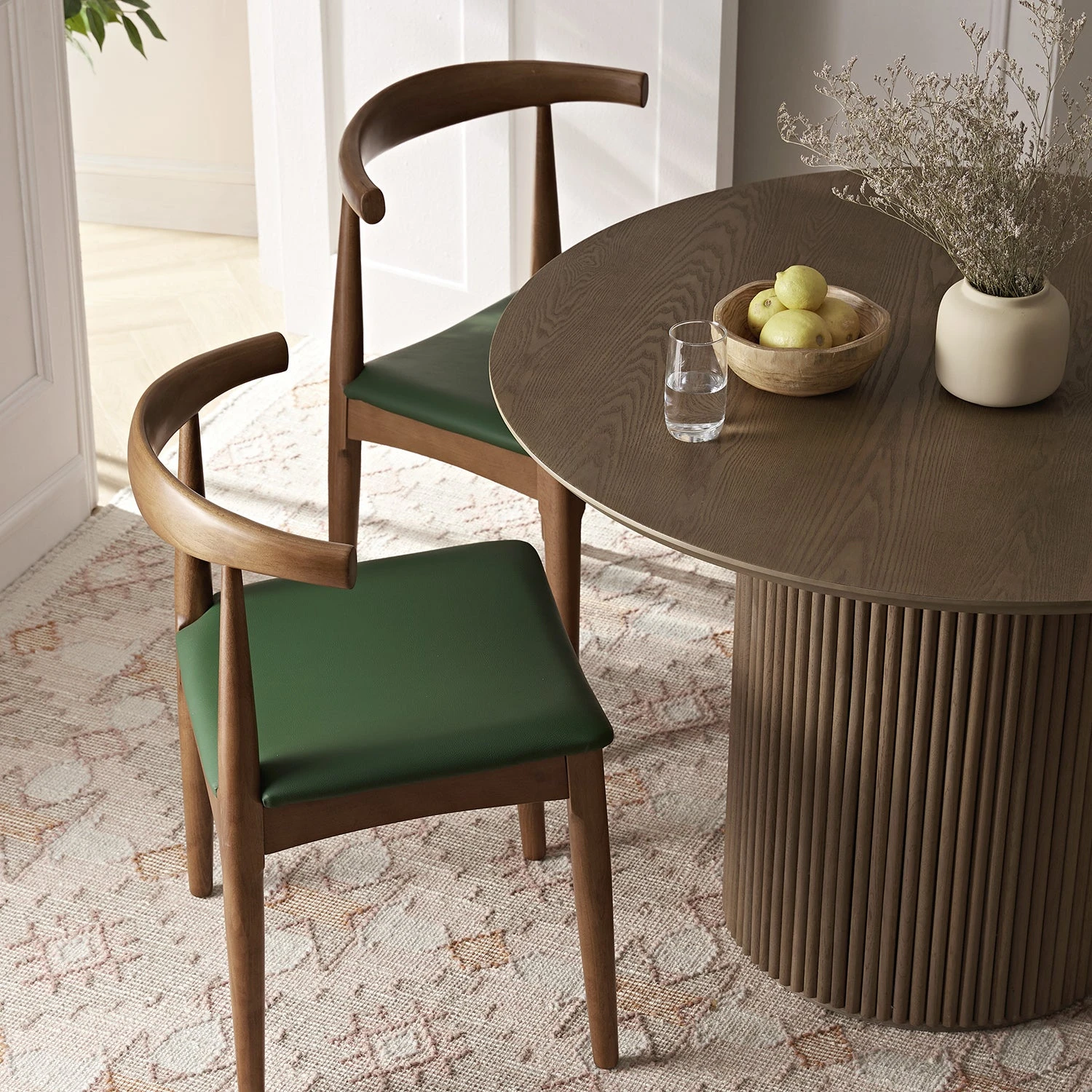 - The chairs are crafted from solid beech wood, featuring curved backrest and padded seat.