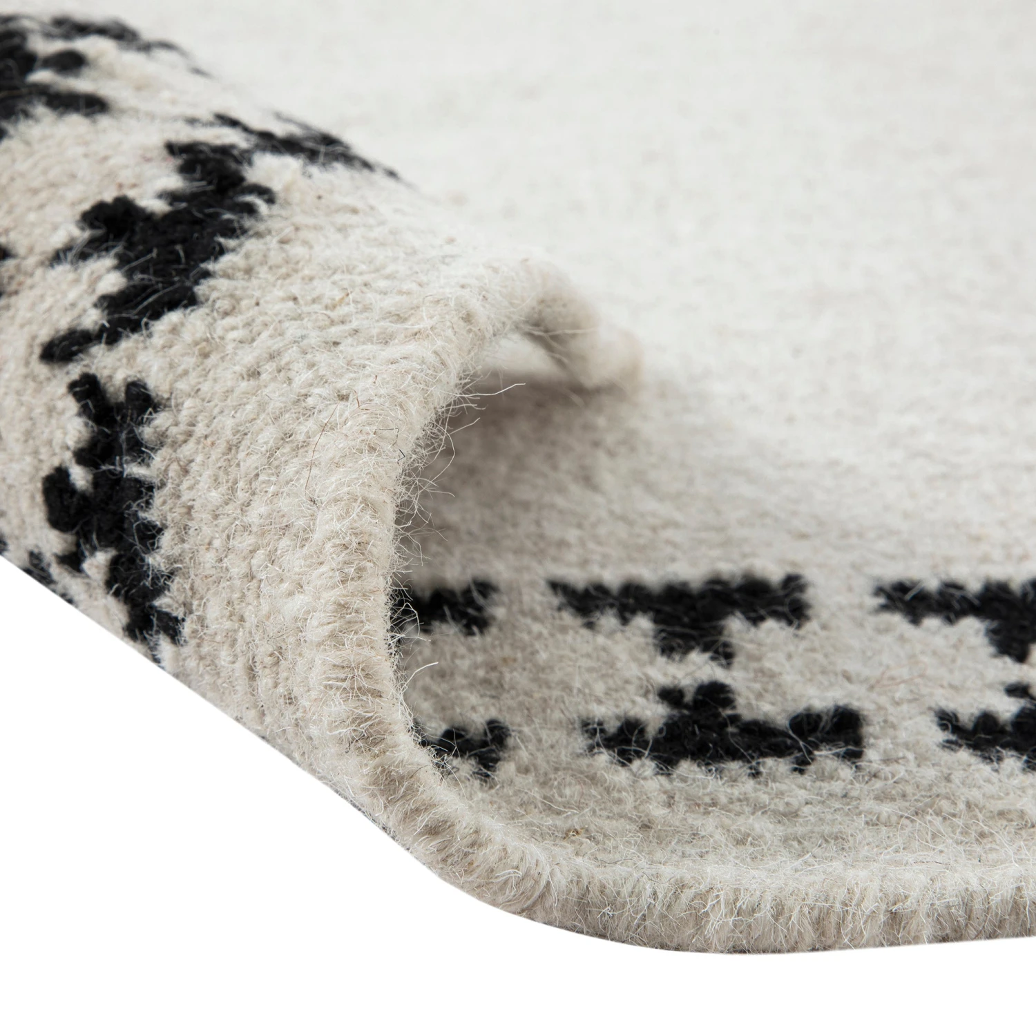 - The Atlan Cream & Black Hand Woven Wool Rug comes rolled and packaged in a clear sleeve
