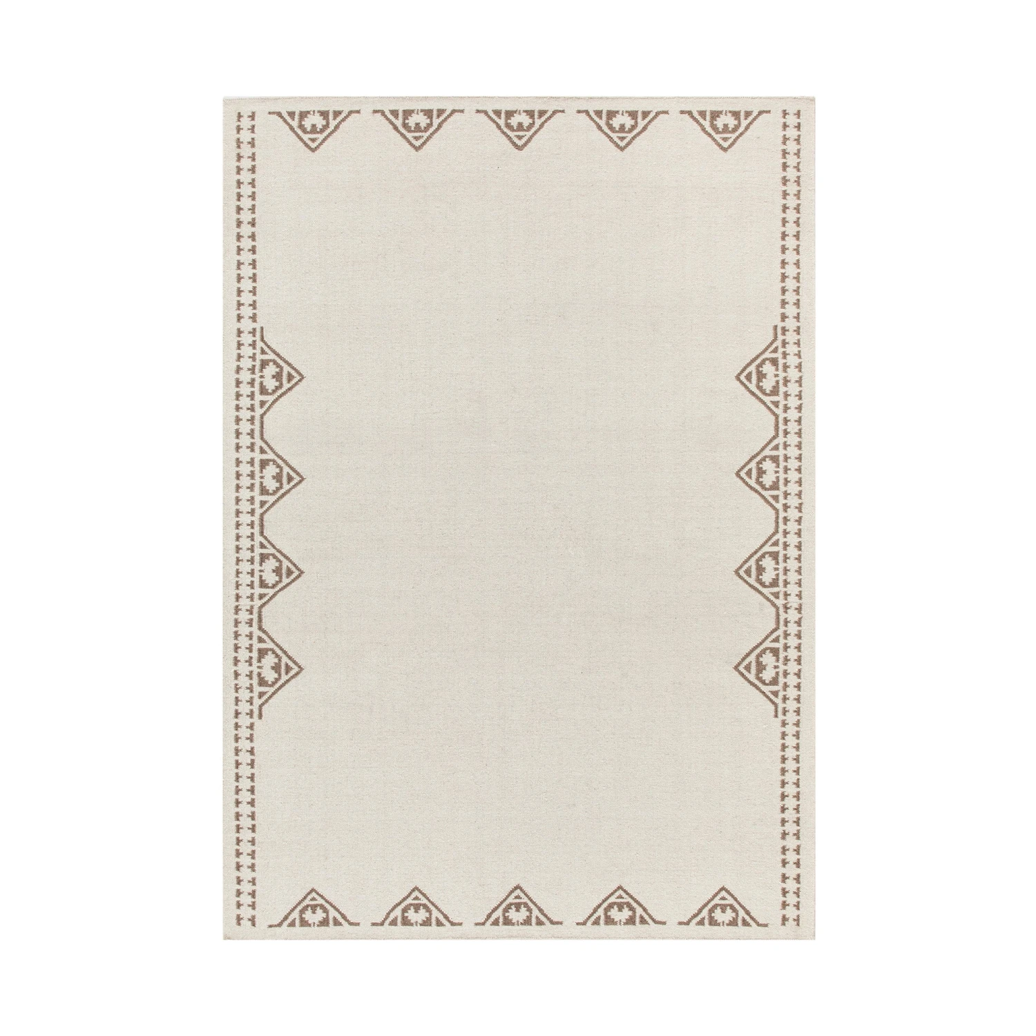 - This stylish cream rug is beautifully finished with an Aztec inspired patterned border in taupe .