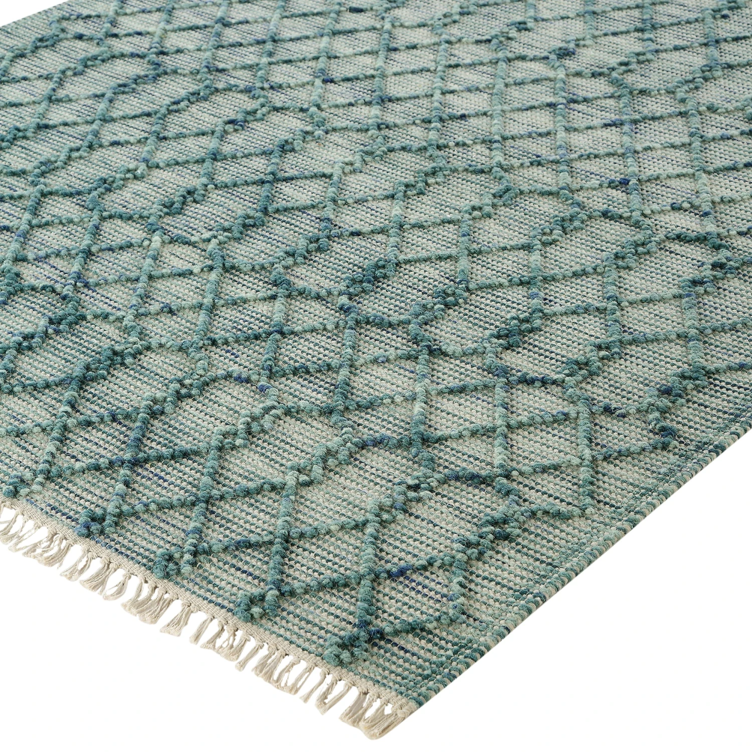 - The Avanti rug features a stylish symmetrical geometric design throughout the rug with a combination of tie-dye wool with tones of blue, green and aqua to create a perfect two-toned effect. The look is then complete with a matching raised bubble weave, in the same marine tones, to create texture. Adding to its authentic, handmade look are handwoven, thin tassels.