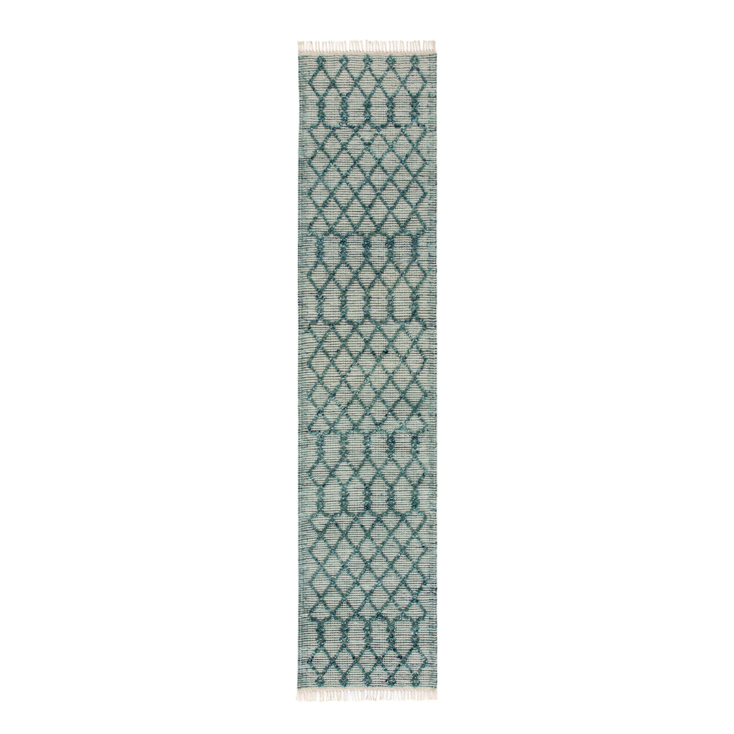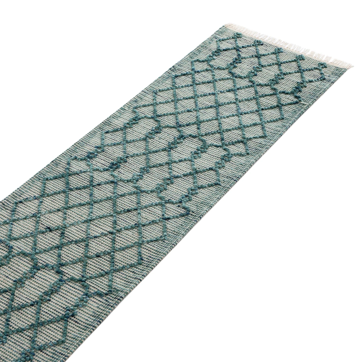 - Encapsulate a fresh feeling and cosy vibes with a timeless, geometric design with our Avanti aquamarine bobble wool runner – the perfect way to add some handwoven texture to your space.