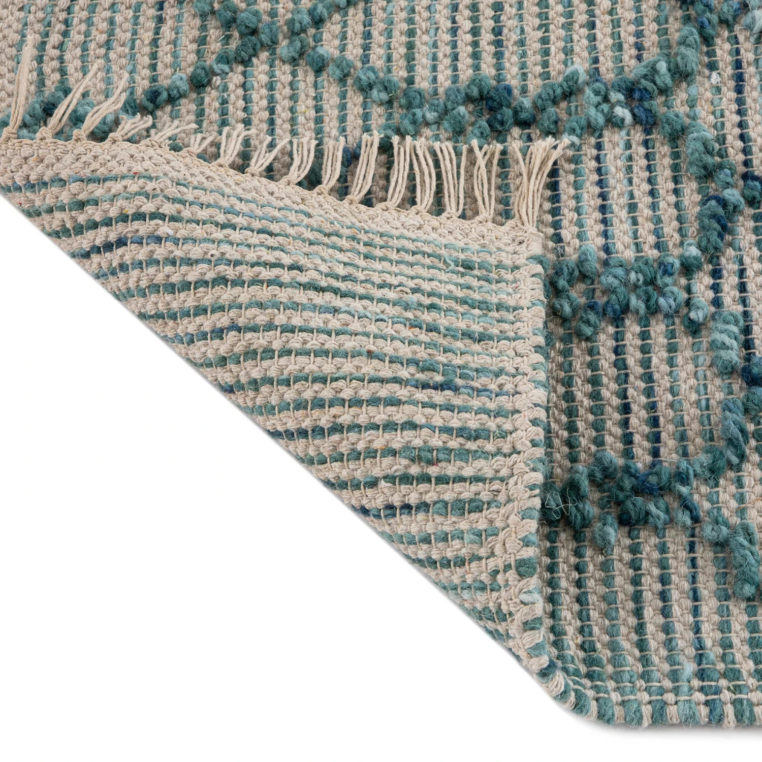 - The Avanti rug features a stylish symmetrical geometric design throughout the rug with a combination of tie-dye wool with tones of blue, green and aqua to create a perfect two-toned effect. The look is then complete with a matching raised bubble weave, in the same marine tones, to create texture. Adding to its authentic, handmade look are handwoven, thin tassels.
