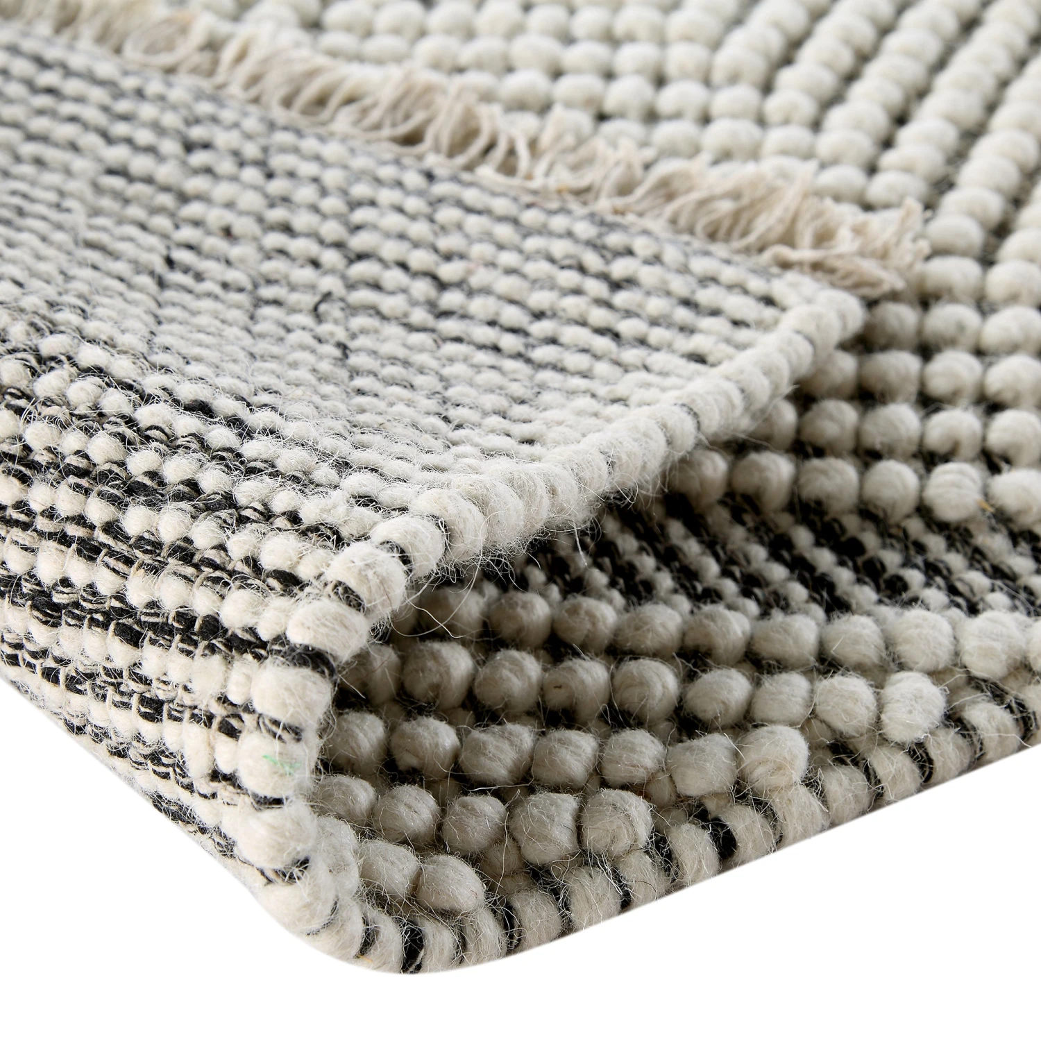 - The look is enhanced with a stunning hand-woven raised bubble weave, in a lovely neutral cream tone, allowing the rug to be a visual statement in any space. Adding to its authentic, handmade look are hand woven thin tassels.