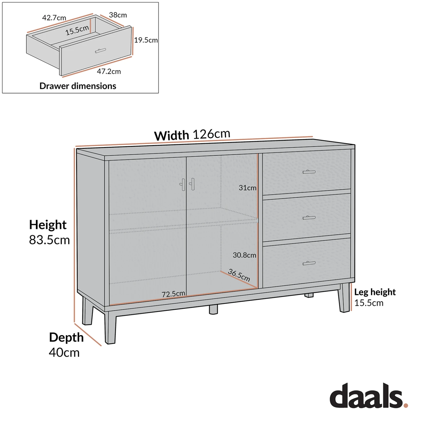 - Drawer internal storage size: W 42.7 x D 38 x H 15.5 cm