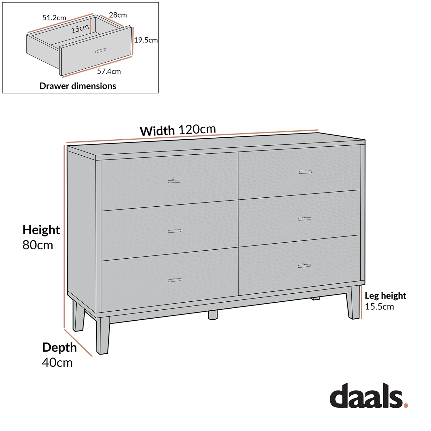 - Drawer internal storage space: W 51.2 x D 28 x H 15 cm