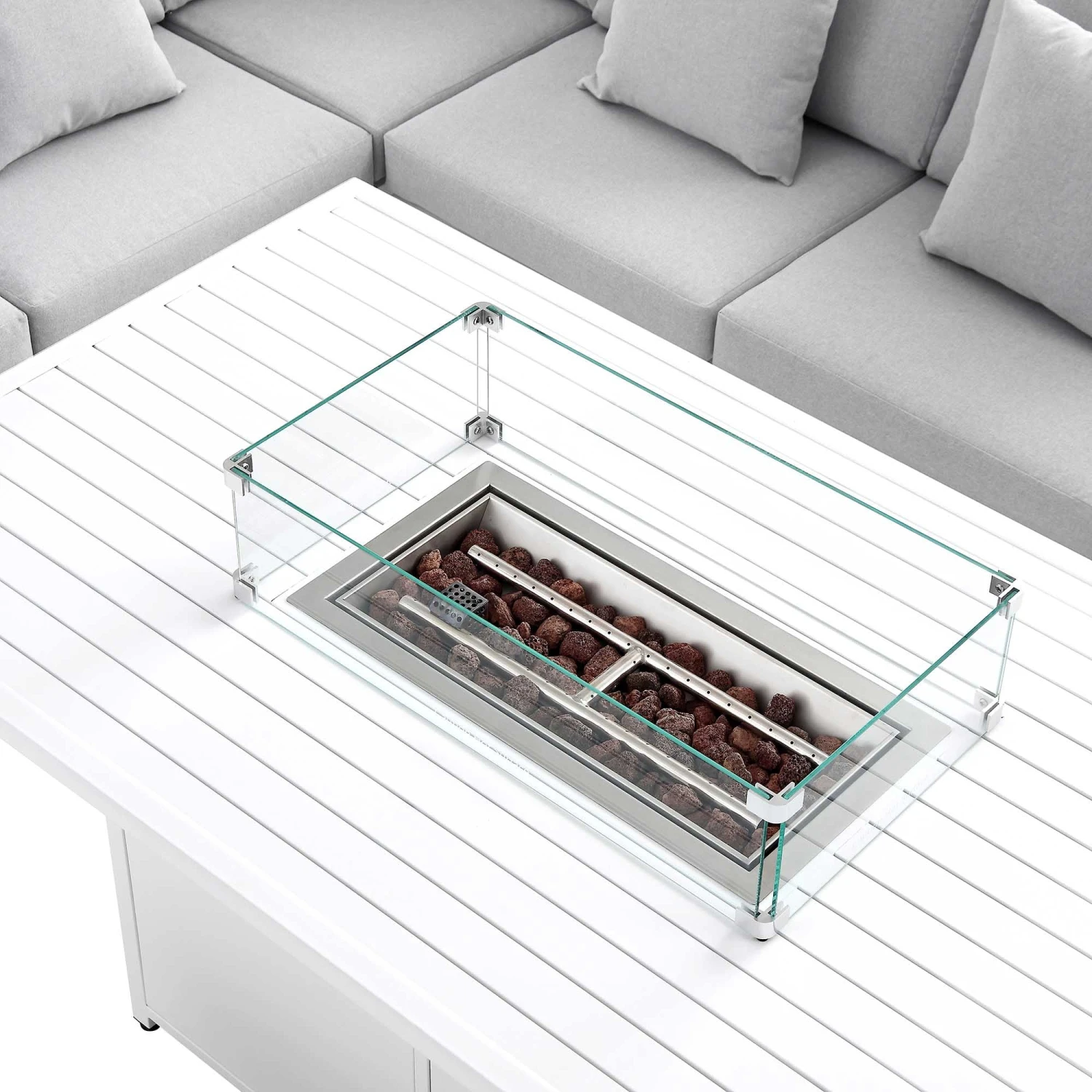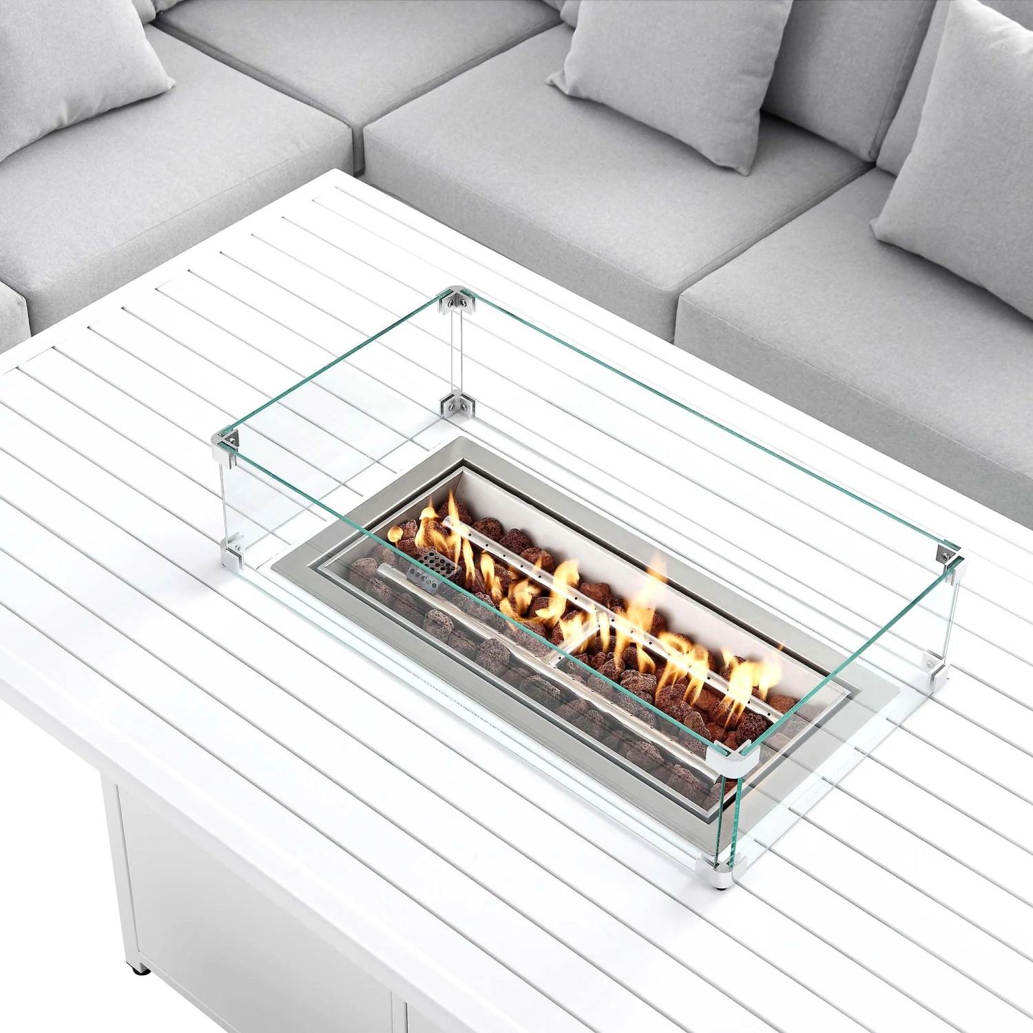 - Perfect for use in the evenings, the firepit table is made from 201 stainless steel and comes with a lid, a protective glass windshield as well as 3kgs of lava rock