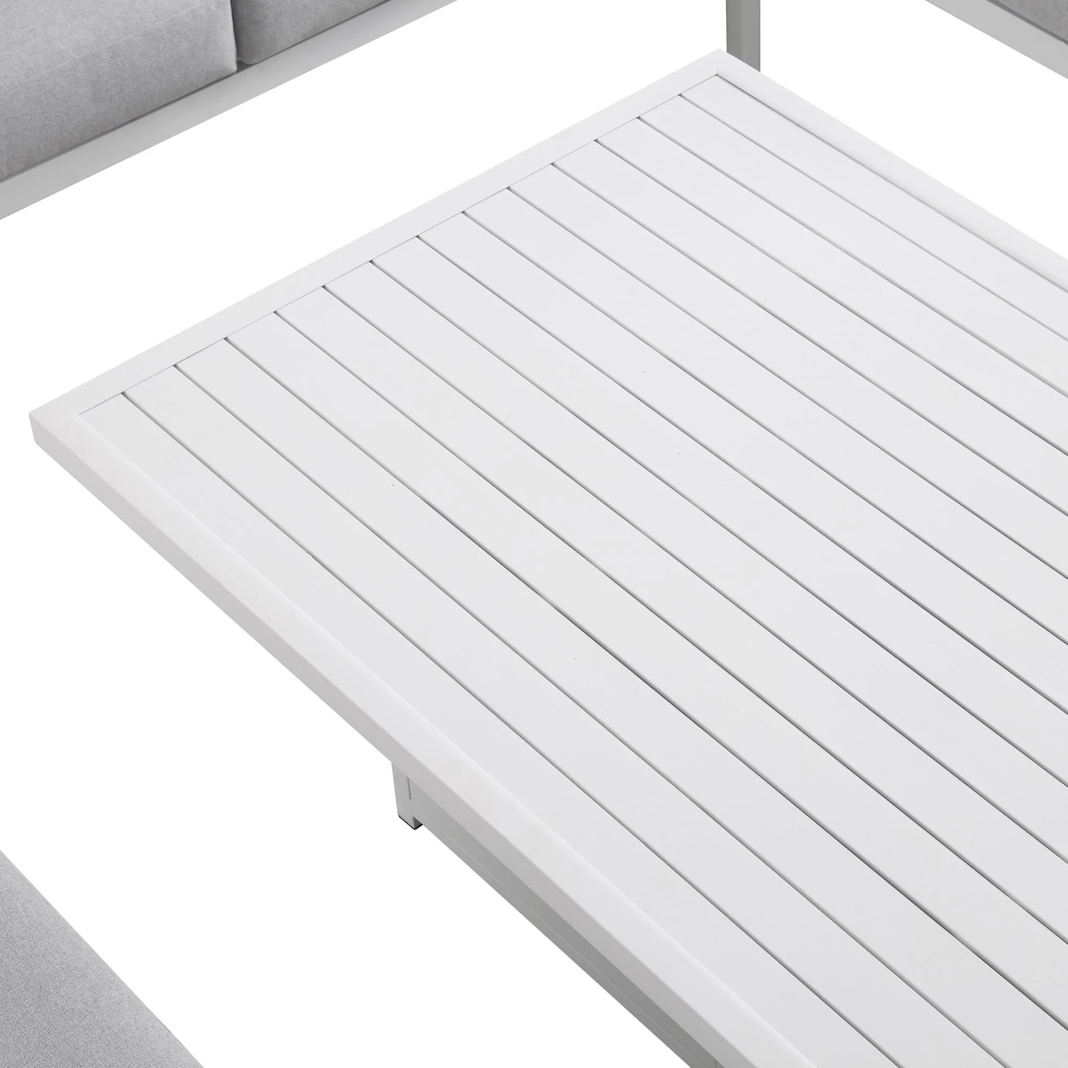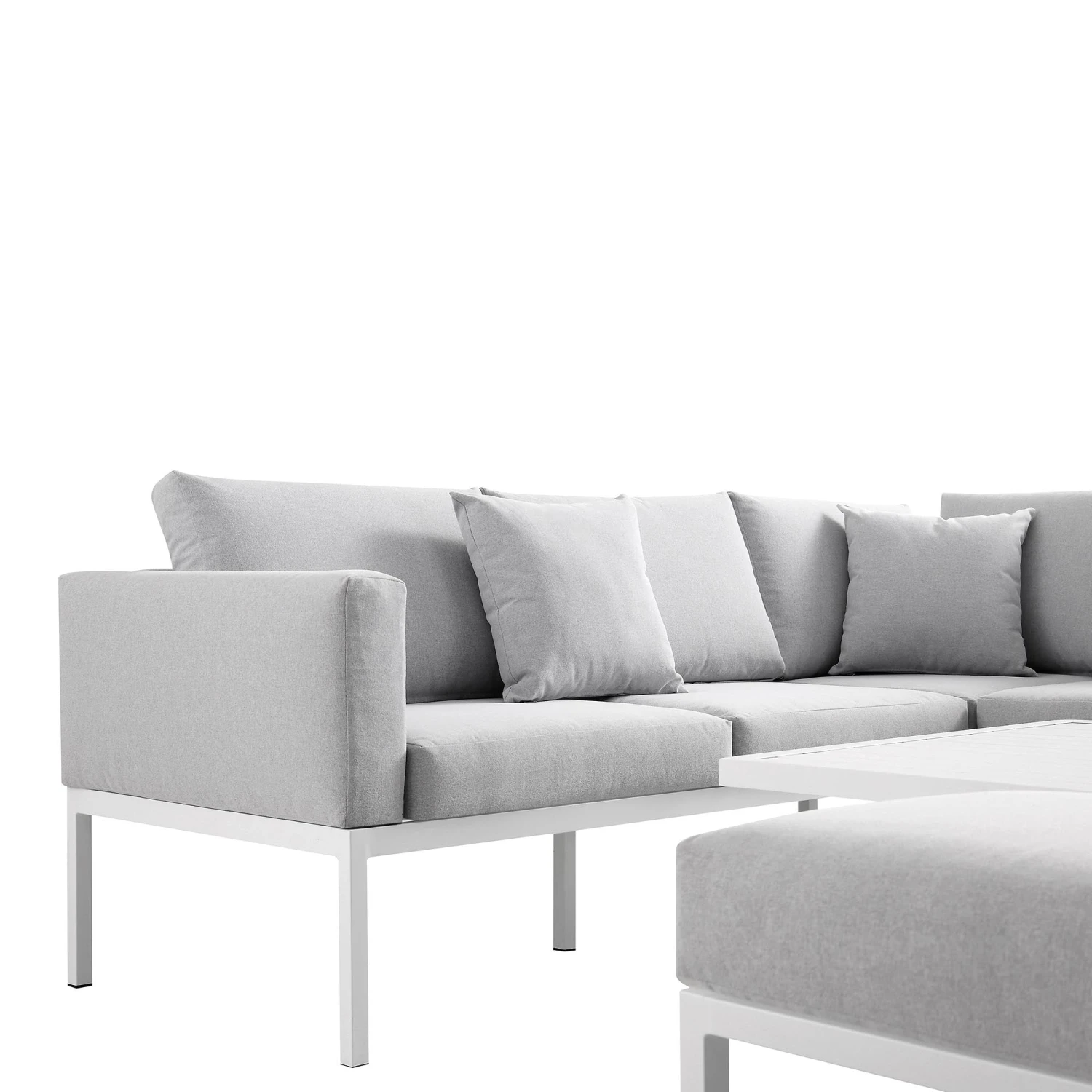 - Comprising of a solid aluminium frame and sumptuous back and seat cushions for added comfort and support, our Calabasas Large Outdoor Fabric and Aluminium Corner Casual Dining Set is perfect for outdoor gatherings