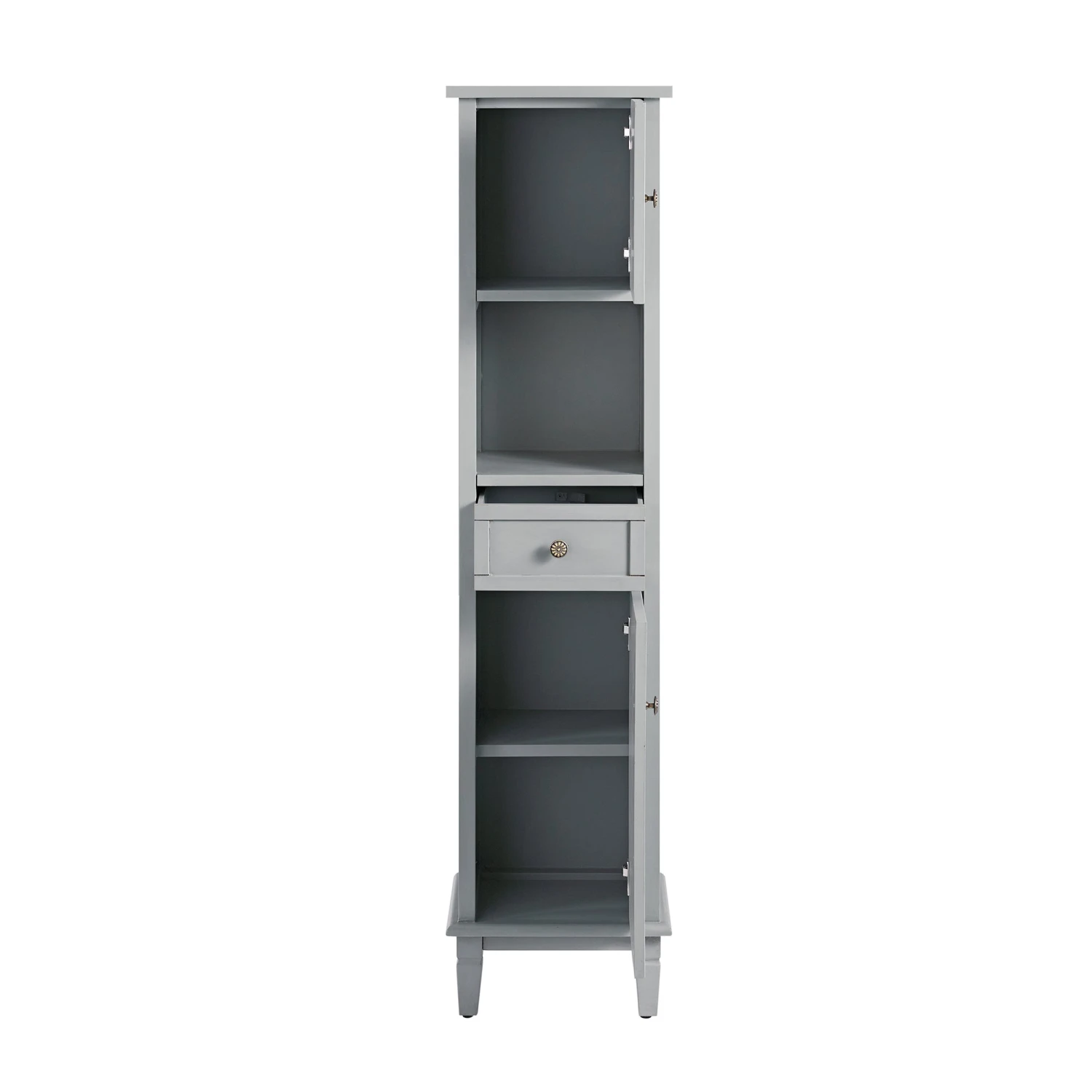 - Designed to make the most of vertical space, our Chantilly Tallboy Cabinet features two closed compartments, an open shelf, and a central drawer, ideal for storing bathroom essentials while adding a decorative focal point.