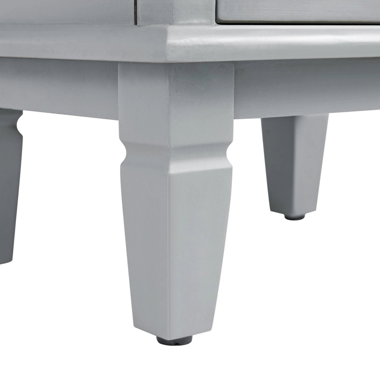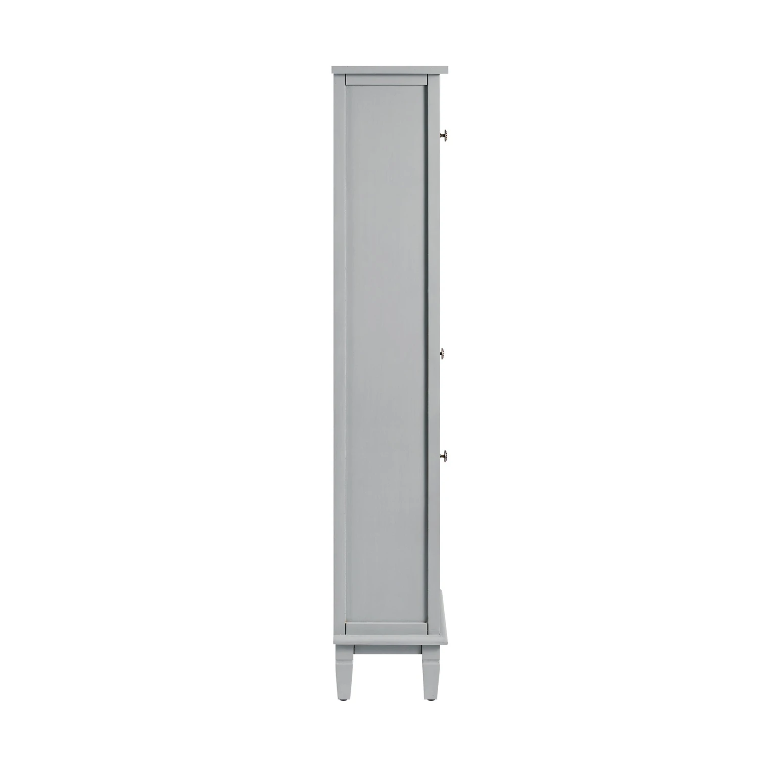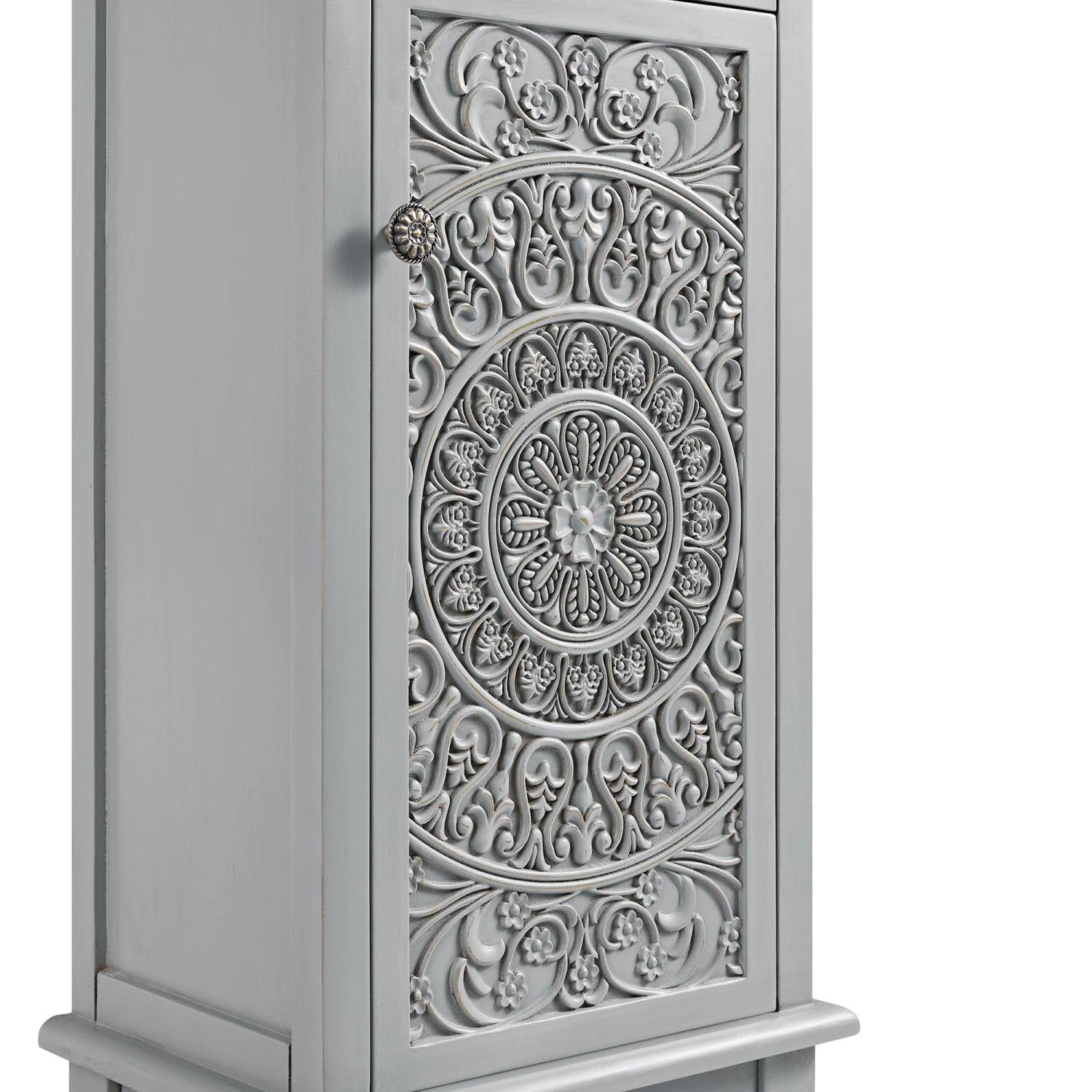 - A tall, elegant storage cabinet finished in mid grey, with intricate floral-carved detailing on both doors.