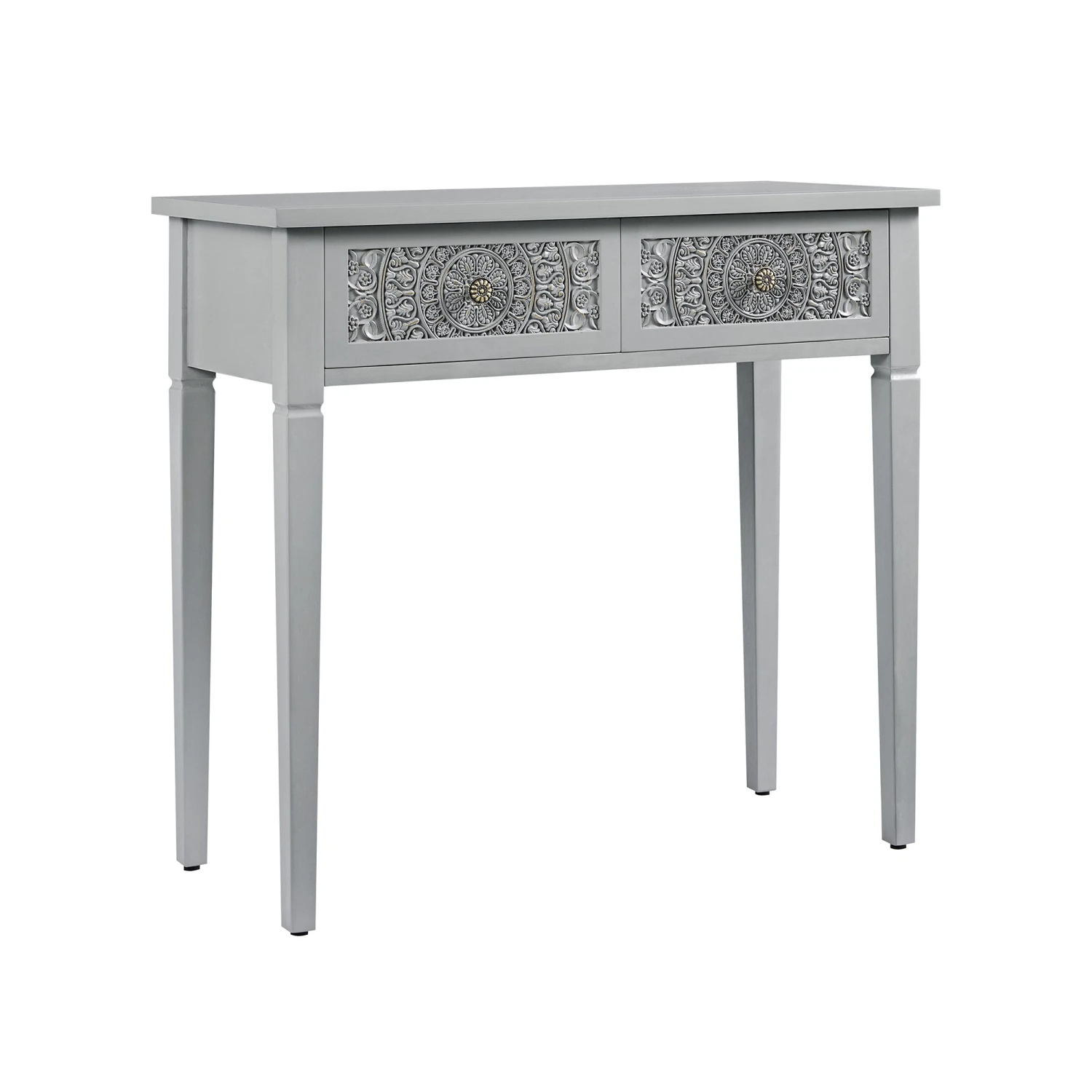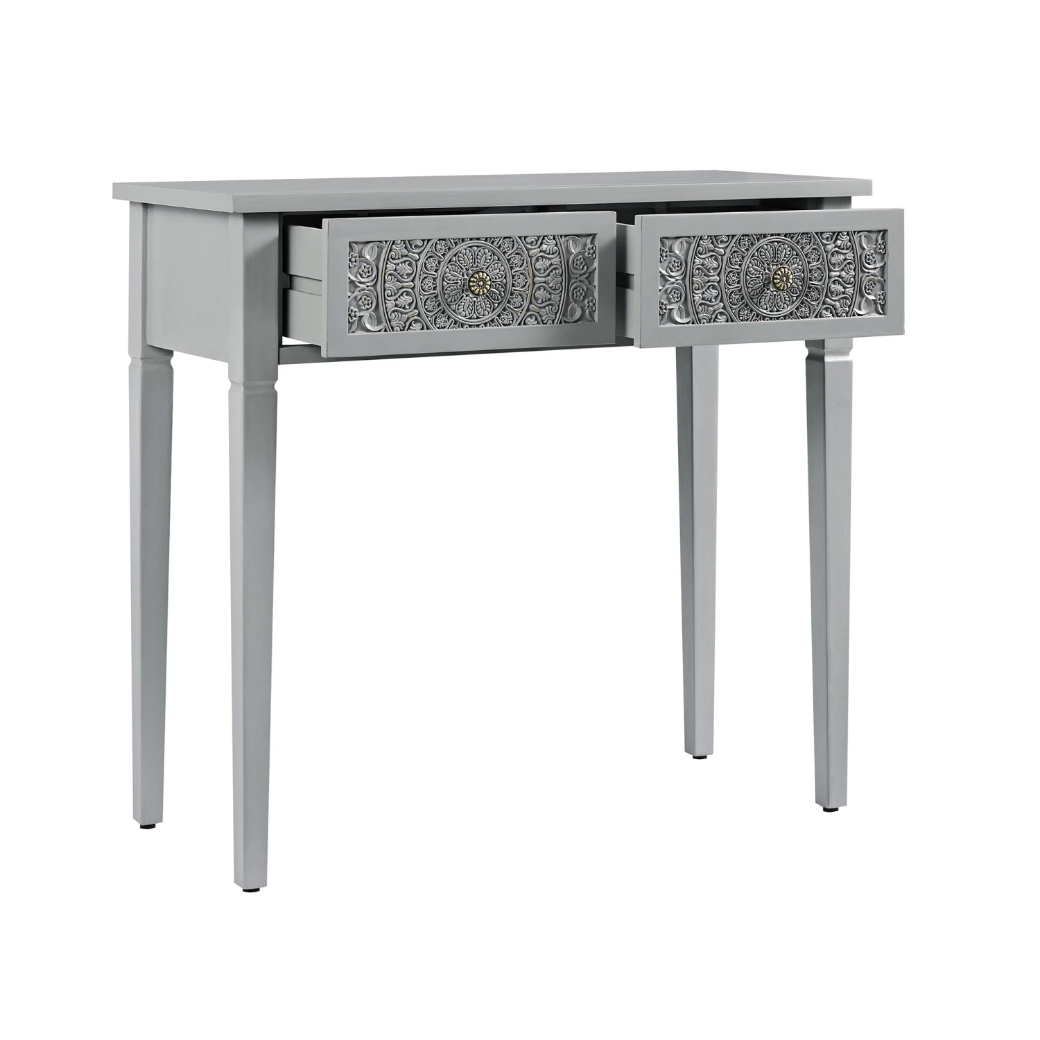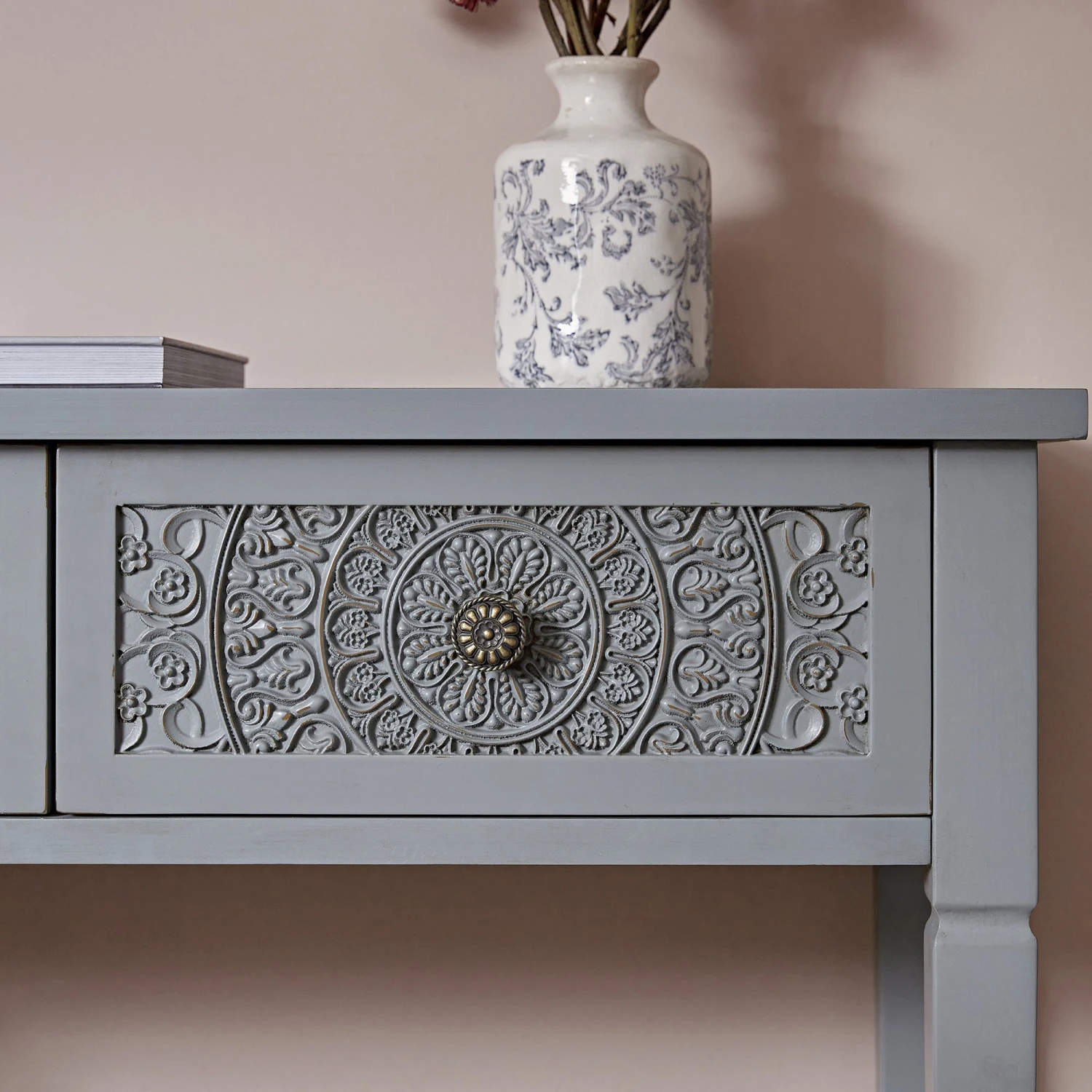 - A romantic reinterpretation of classic, the Chantilly Carved Console Table in Mid Grey brings timeless charm to your hallway, bedroom, or living space.