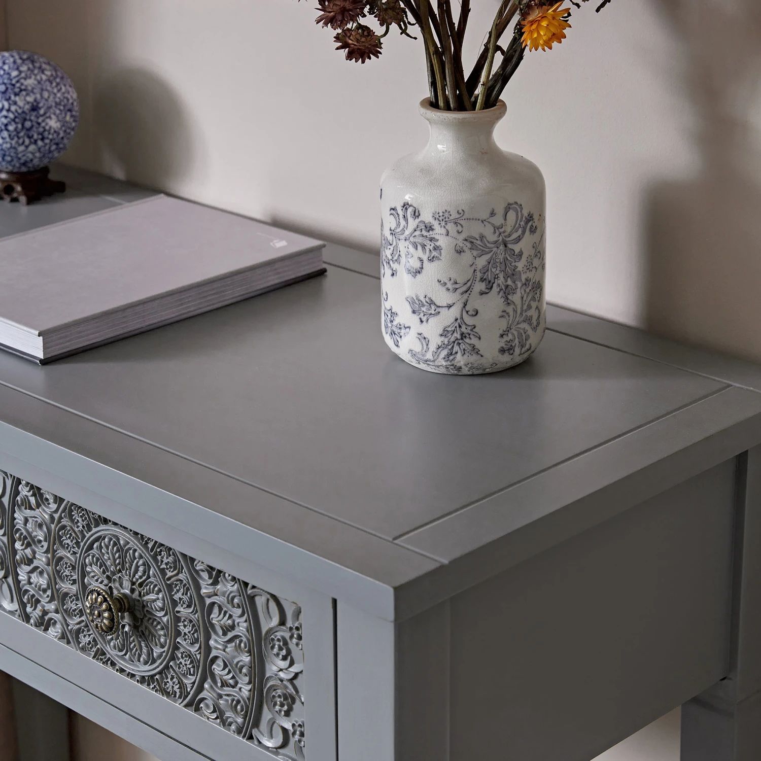 - Complete the look: Pictured with the Chantilly Mid Grey Carved Console/ Dressing Table is our Minley Light Taupe High Gloss 2-in-1 Dining Chair and Villa Stripe Handwoven Grey Rug.