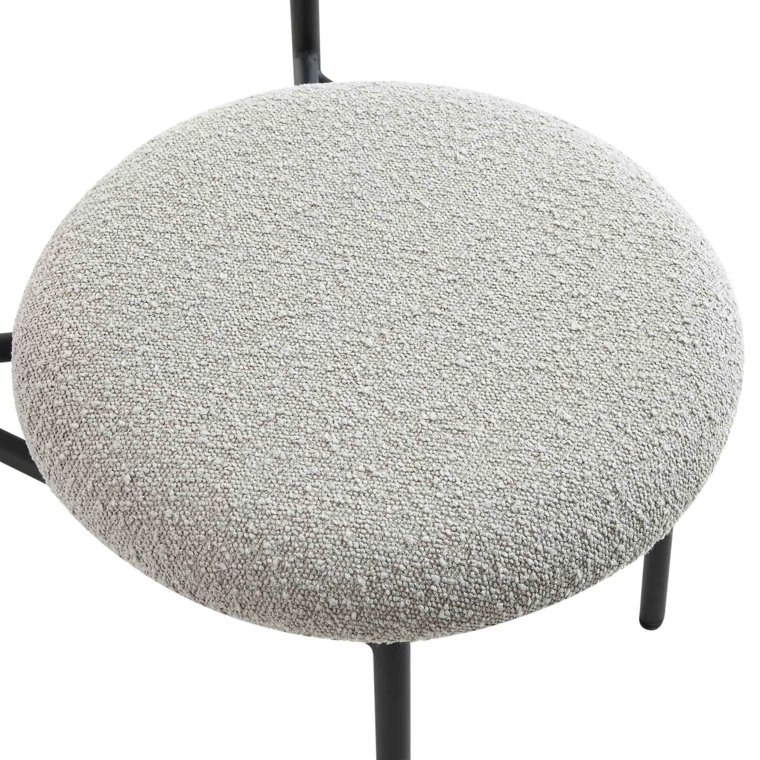 - Upholstered in light grey textured boucle fabric that goes well with any contemporary home decor.