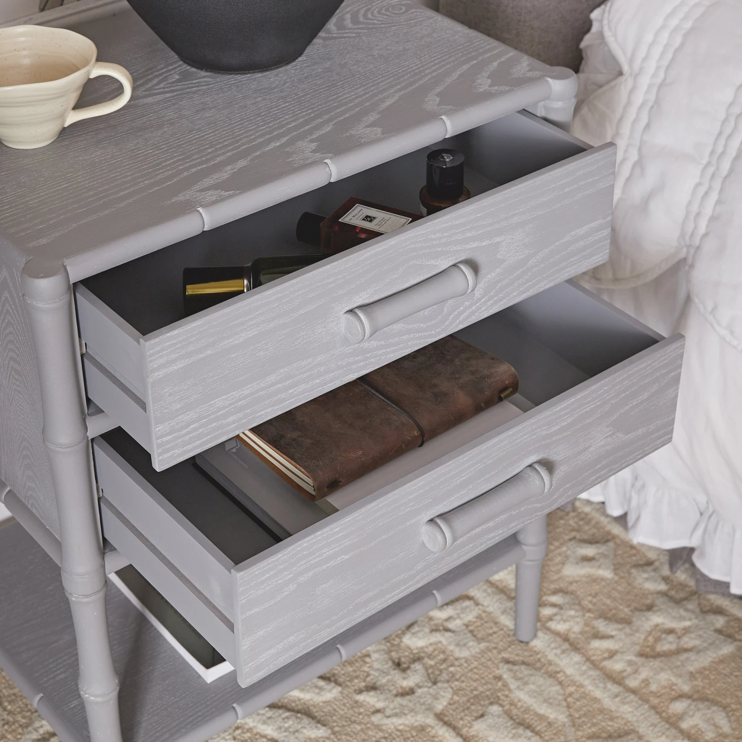 - Complete the look: Pictured with the Elstowe Warm Grey Faux Bamboo Bedside Table is our Matilda White Scallop Quilted Bedspread, Matilda White Ruffle Duvet Set, Lourdes Hand Tufted and Textured Cream Wool Rug and Egerton Stone Box-Pleat Ottoman Storage Bed.