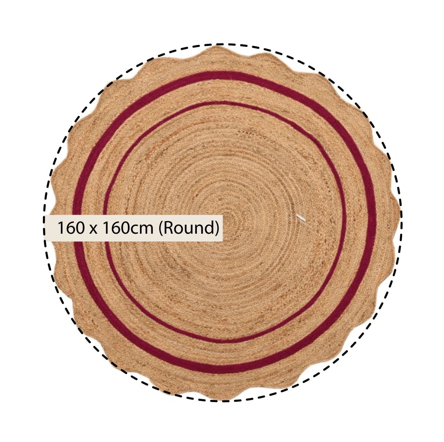 - Evie’s design incorporates a subtle spiral appearance towards the centre of the rug. This is complemented by the classic scalloped edge and a striking, scarlet red double border to add contrast to the jute.