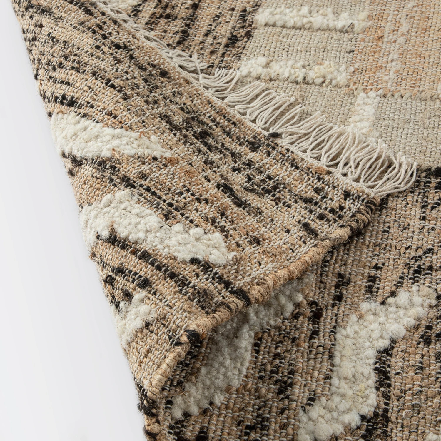 - This stylish rug has a neutral colour palette, the speckled brown border perfectly complements the timeless beige background. The rug is also enhanced with tassels that add to its authentic, handmade feel.