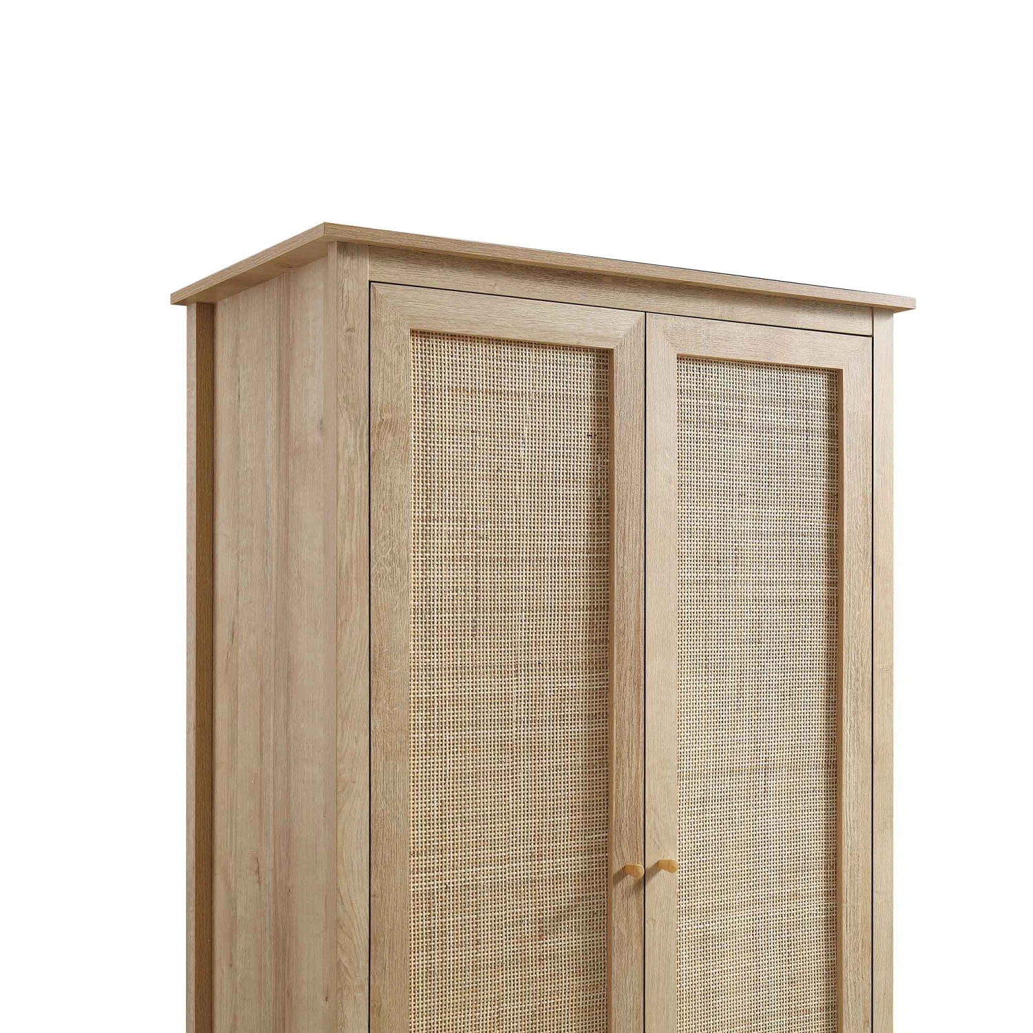 - Hand woven natural rattan inserts on the wardrobe doors coordinate with solid wood door handles.