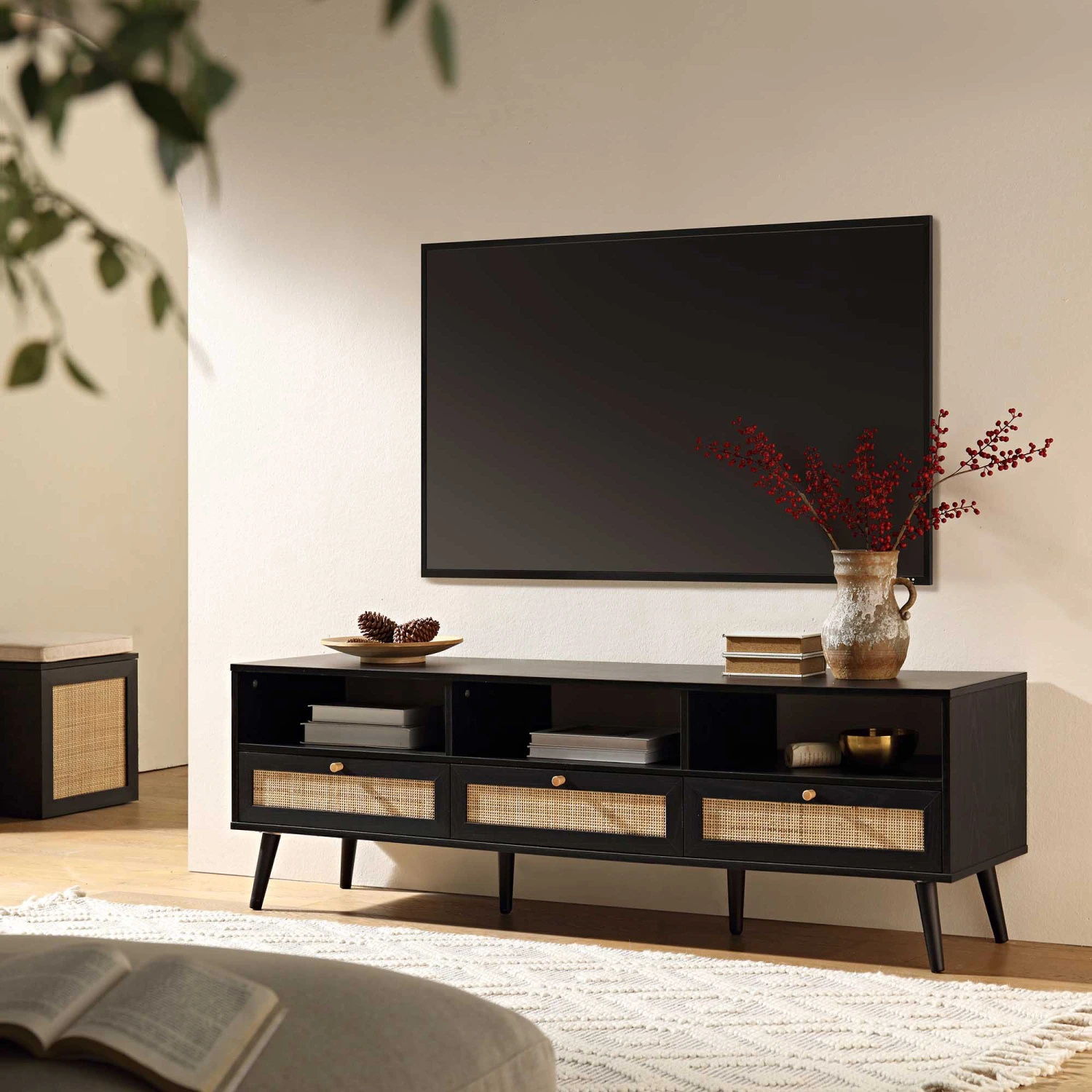 - Complete the look: Pictured with our Frances Woven Rattan 160cm 3-Drawer TV Unit is our matching Frances Woven Rattan Single Storage Stool in Black and our Avanti Handwoven Cream Bobble Wool Rug