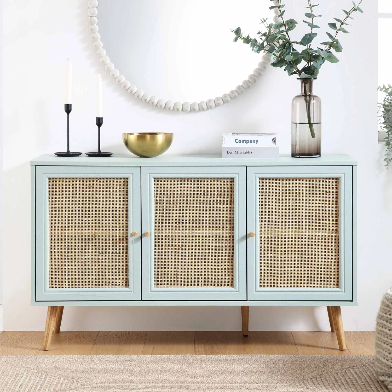 - Complete the look: Pictured with our Mint Frances Woven Rattan 3-Door Sideboard is our Luna Round Bobbin Wall Mirror in a washed white finish.