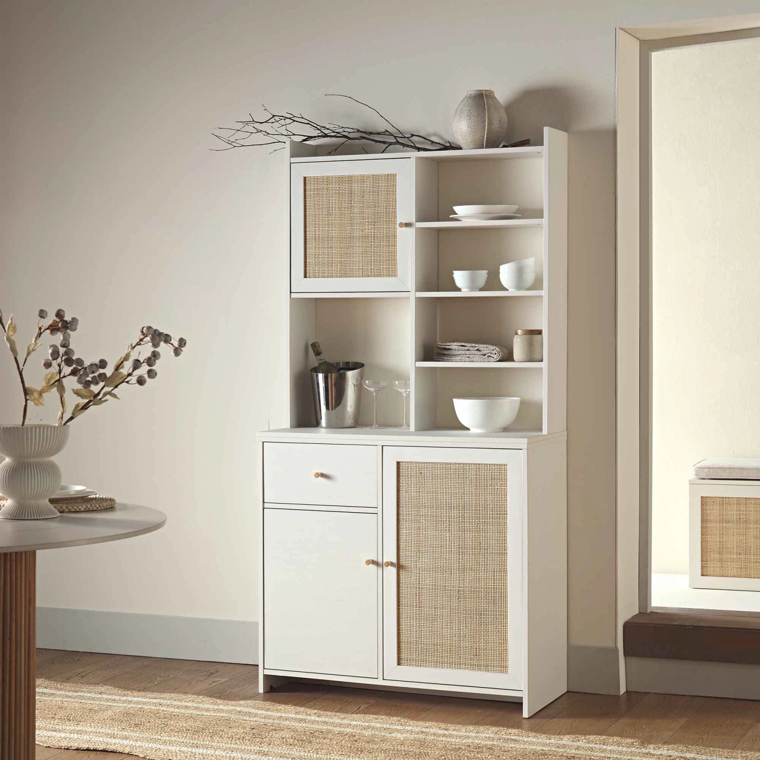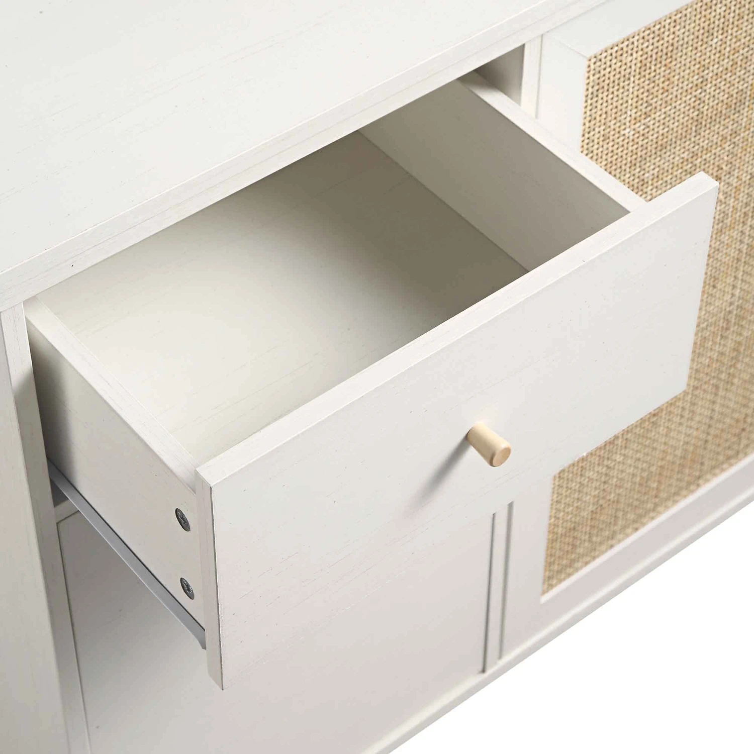 - Complete the look: Pictured with our Frances Woven Rattan Dresser is our Maru Ceramic Top Oak Pedestal Dining Table, our Evie Hand braided Jute Scallop Runner and our Frances Woven Rattan Double Storage Stool in White