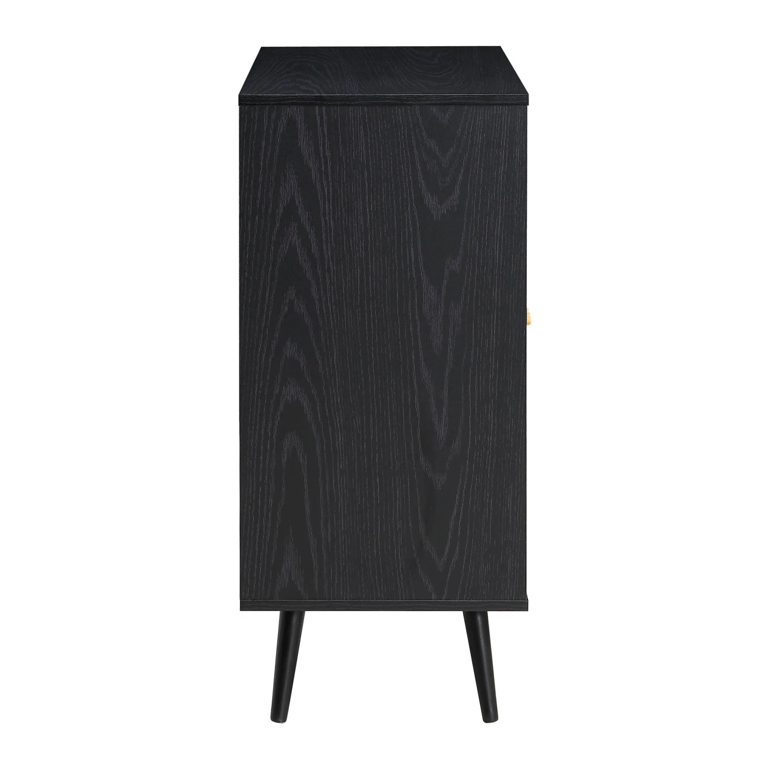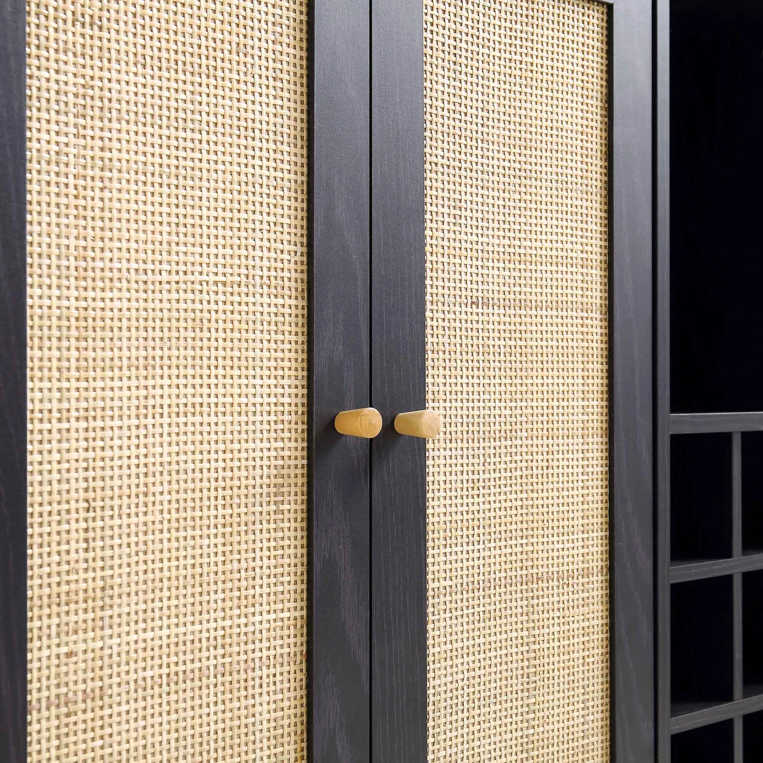- Hand woven natural rattan inserts on the cabinet door coordinate with solid wood handle and legs to create a cosy, earthy look.