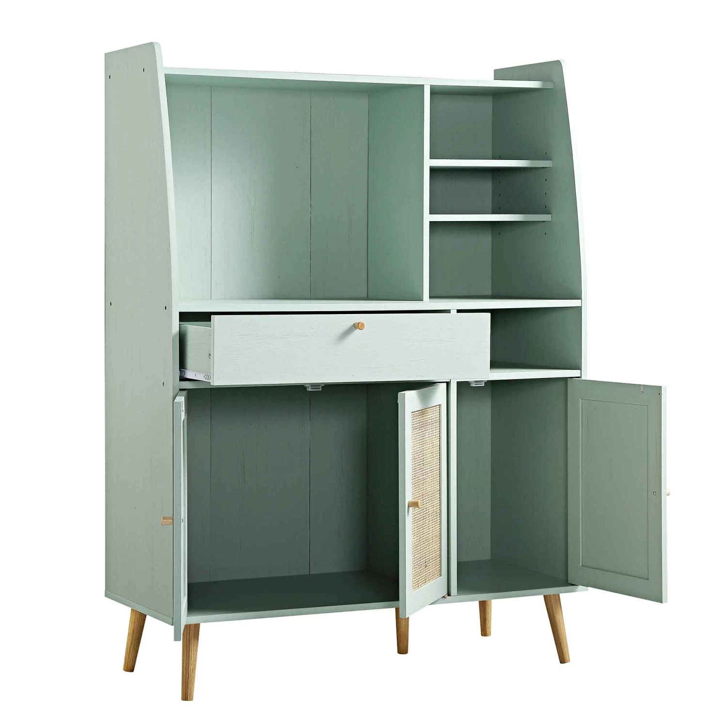 - With a range of multi-level shelves perfect for displaying glasses and small appliances, this highly functional Frances Kitchen Cabinet also comes with a drawer and closed cabinet space. The hand-woven natural rattan door fronts perfectly coordinate with the solid wood handles.