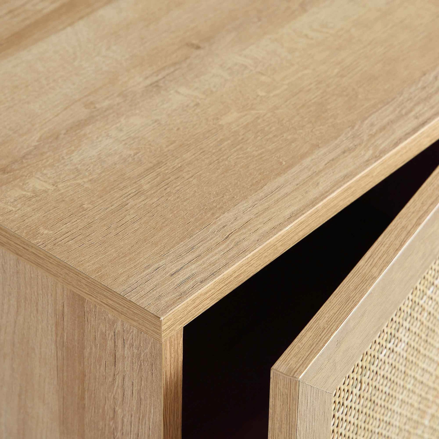 - The rattan doors and drawer are completed with a solid wood handle, adding to the minimalist nature of the unit