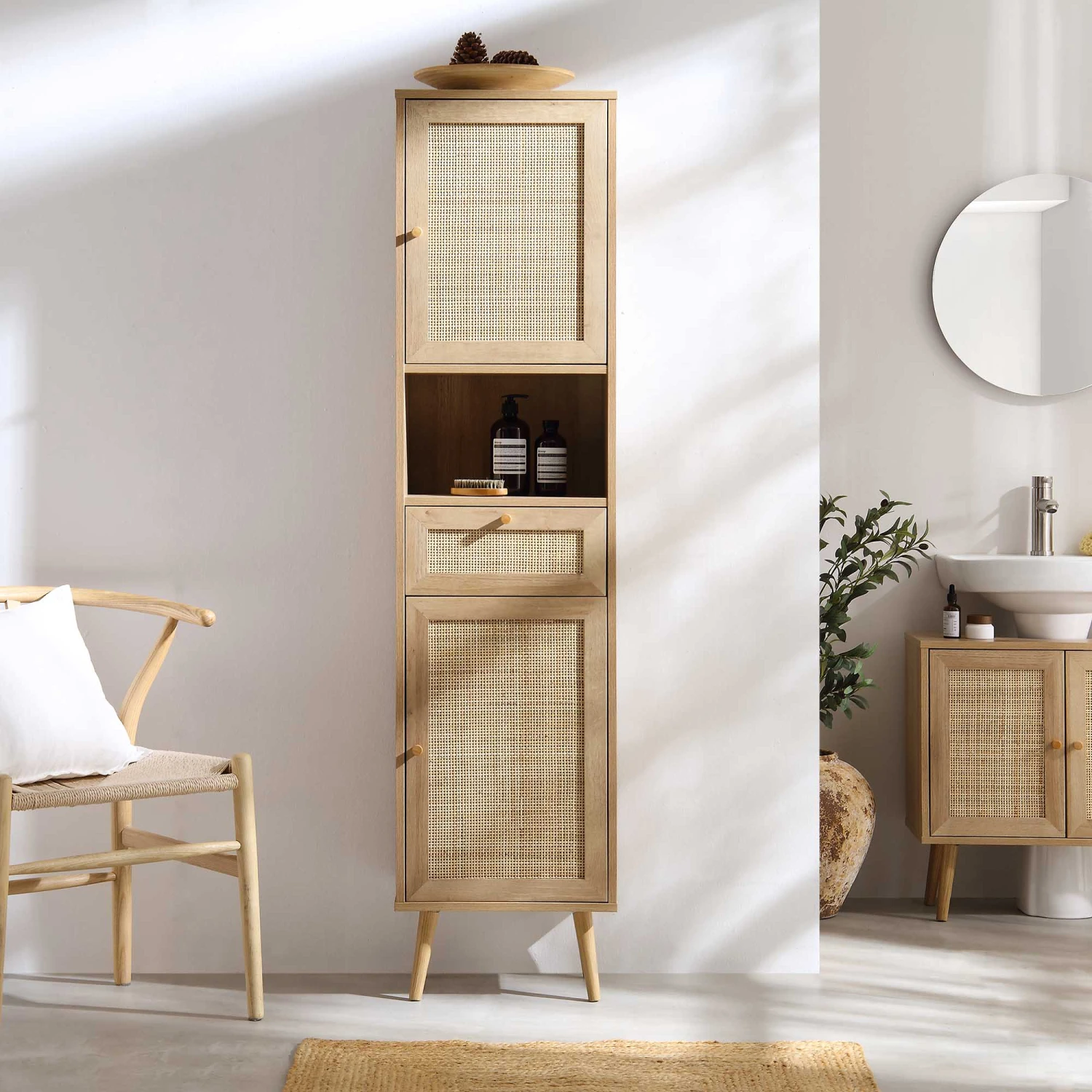 - With spacious shelving behind two rattan doors as well as having an open shelf and drawer, our Frances Rattan Tallboy Unit is the perfect storage solution to have in the bathroom