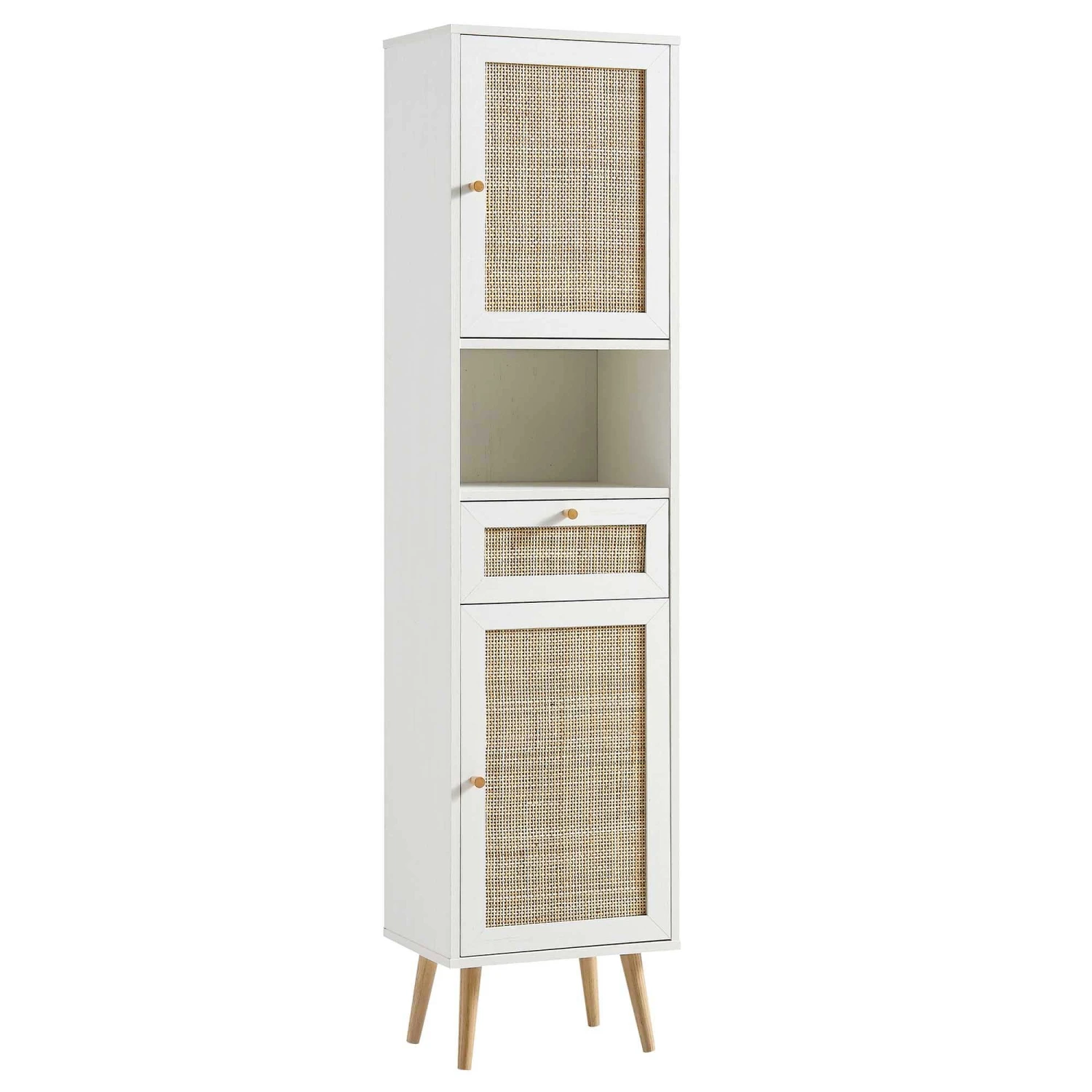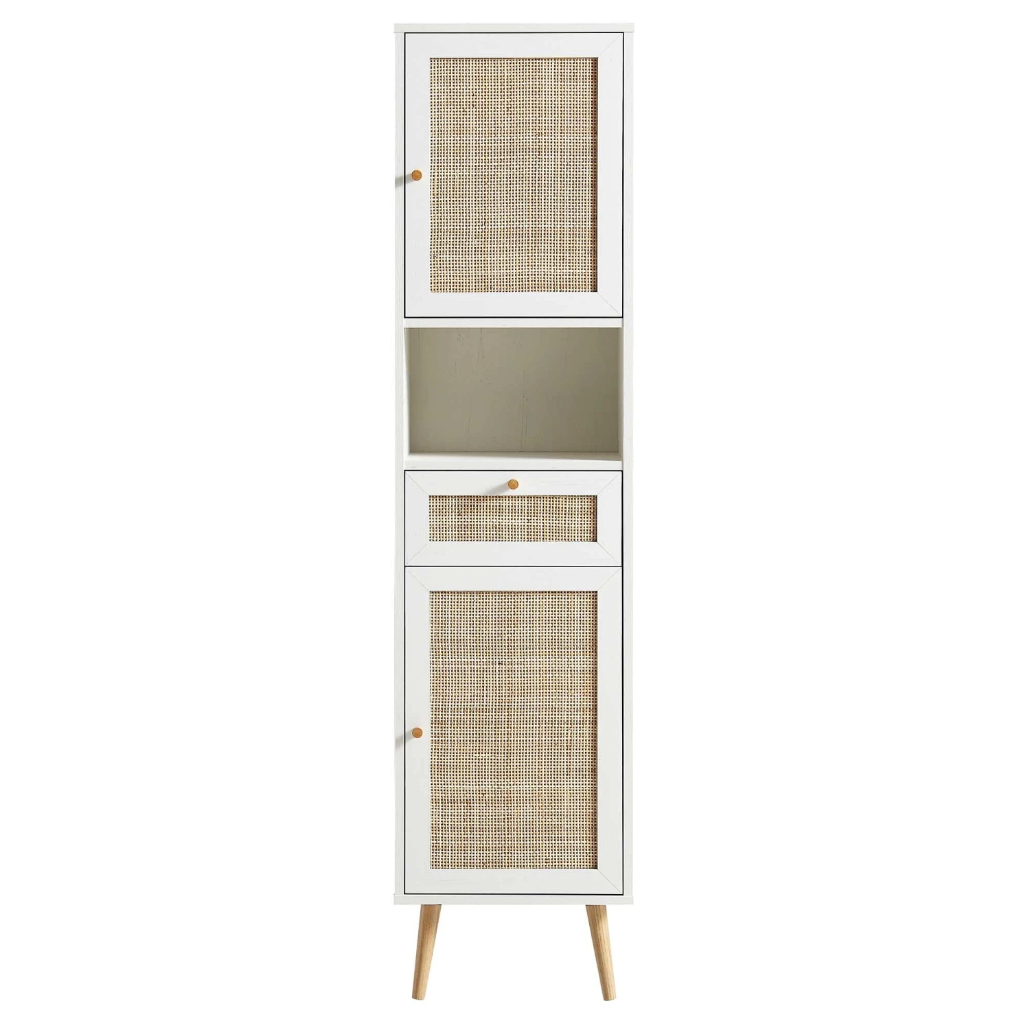 - With spacious shelving behind two rattan doors as well as having an open shelf and drawer, our Frances Rattan Tallboy Unit is the perfect storage solution to have in the bathroom