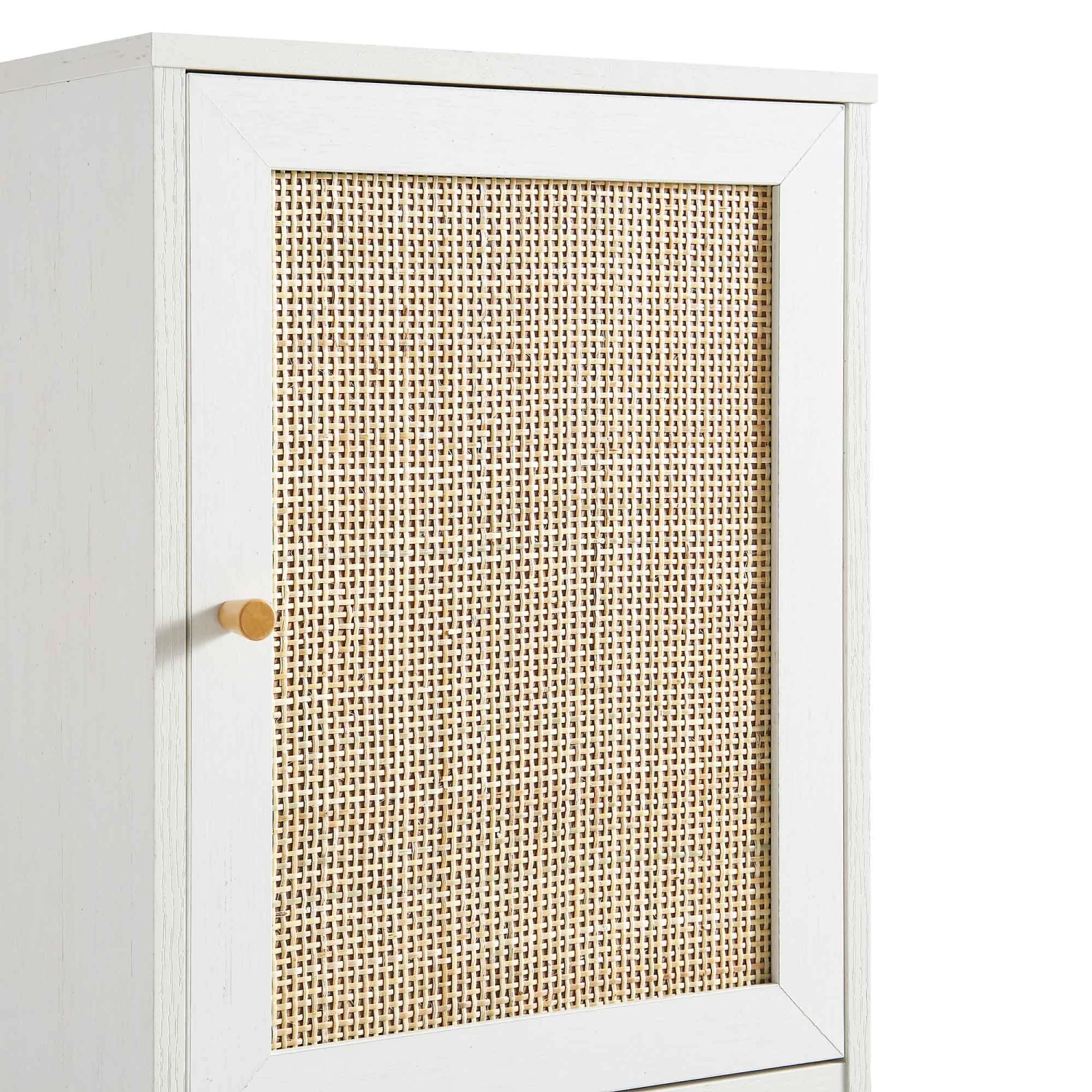 - The rattan doors and drawer are completed with a solid wood handle, adding to the minimalist nature of the unit