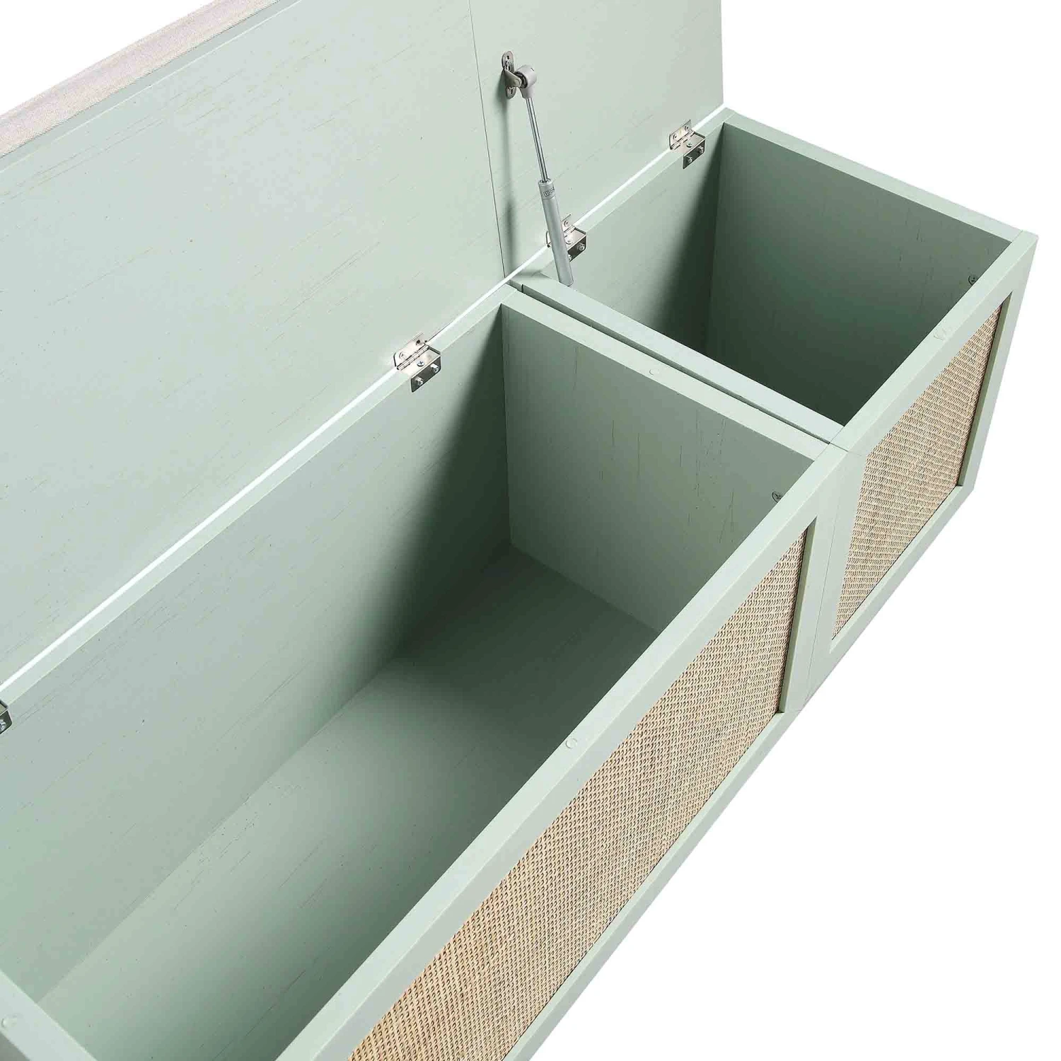 - The natural woven rattan fronts are complemented by oatmeal fabric cushion.