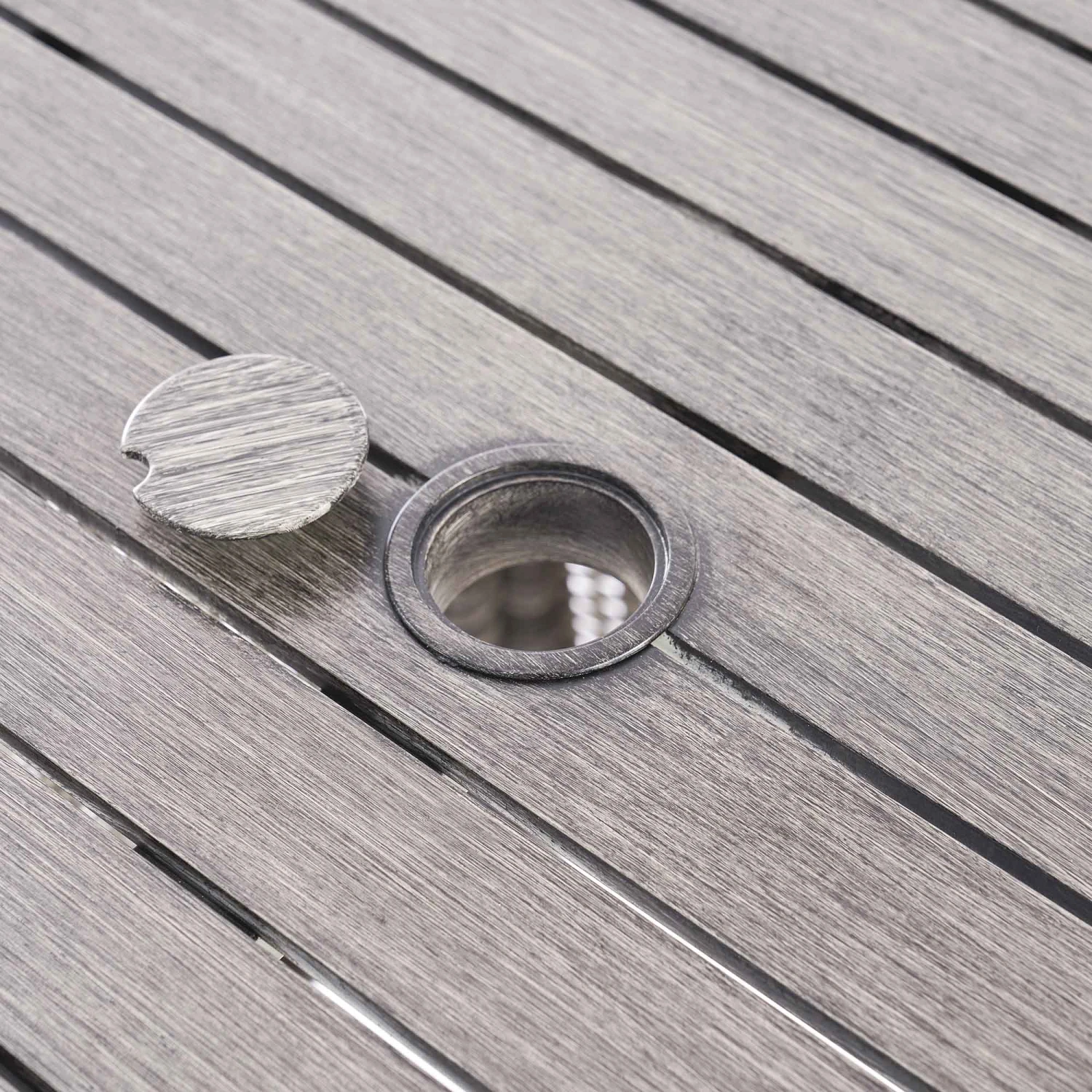 - The dining table is topped with sturdy aluminium slats making it sturdy, whilst the look is completed thanks to its wooden effect finish.