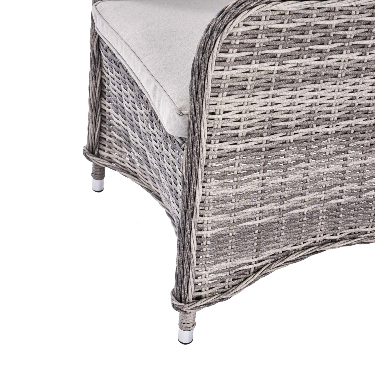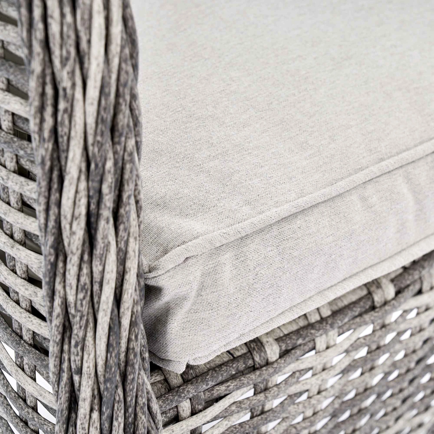 - Light grey coloured 100% polyester seat cushions perfectly coordinate with the grey wicker weaves.