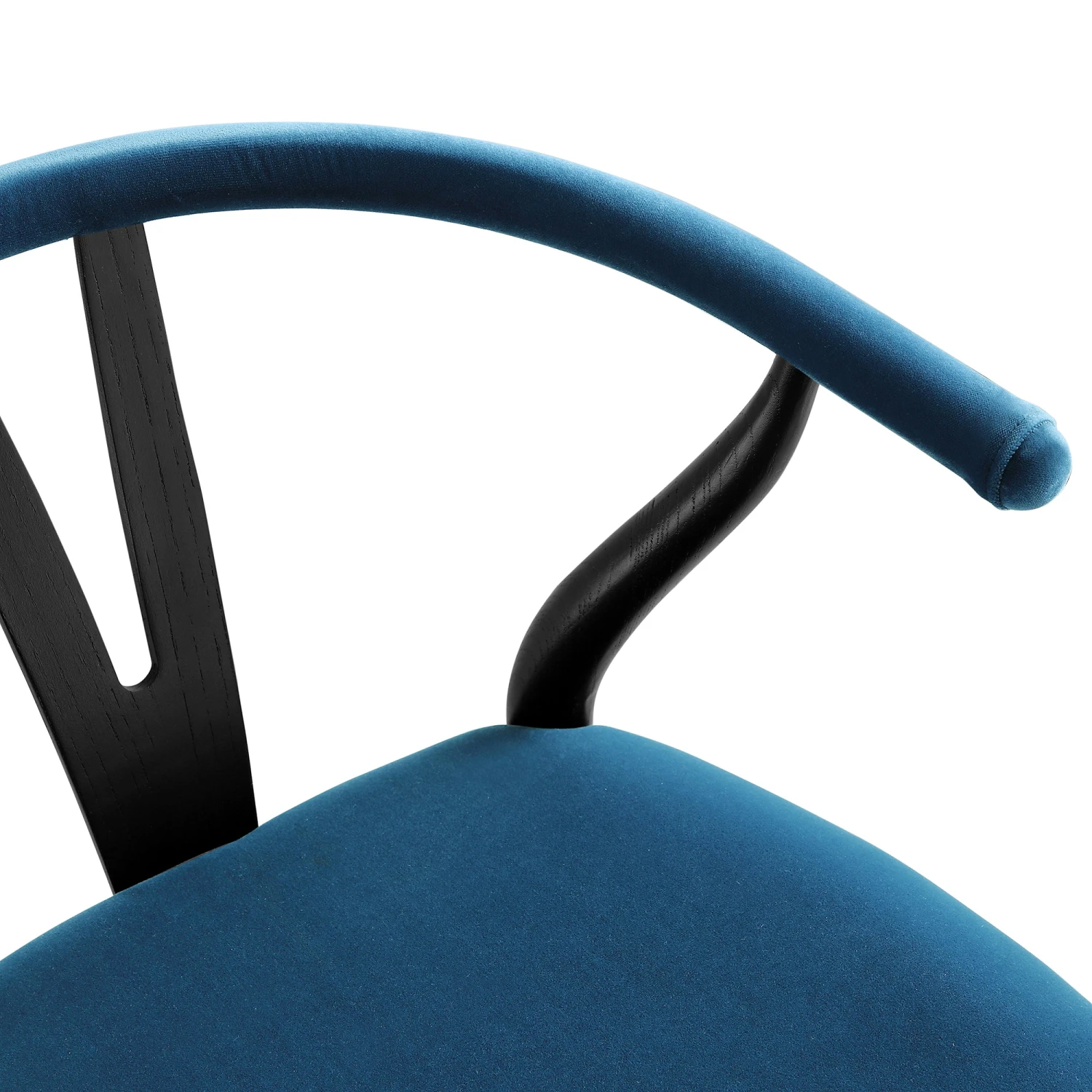 - Upholstered in beautiful deep blue velvet, the chair is sturdily crafted from solid elm wood in black finish.