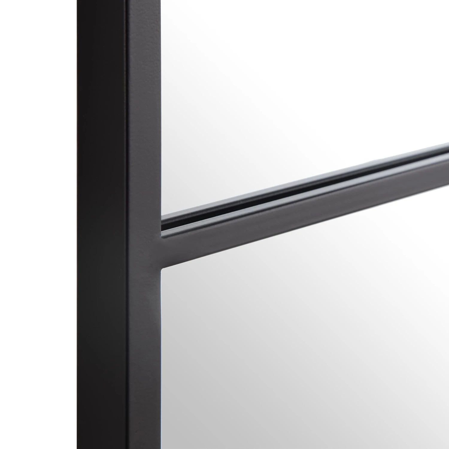 - The metal frame is handcrafted with black powder coated finish, layered onto a 118 x 118 cm mirror glass to create a window panel look.