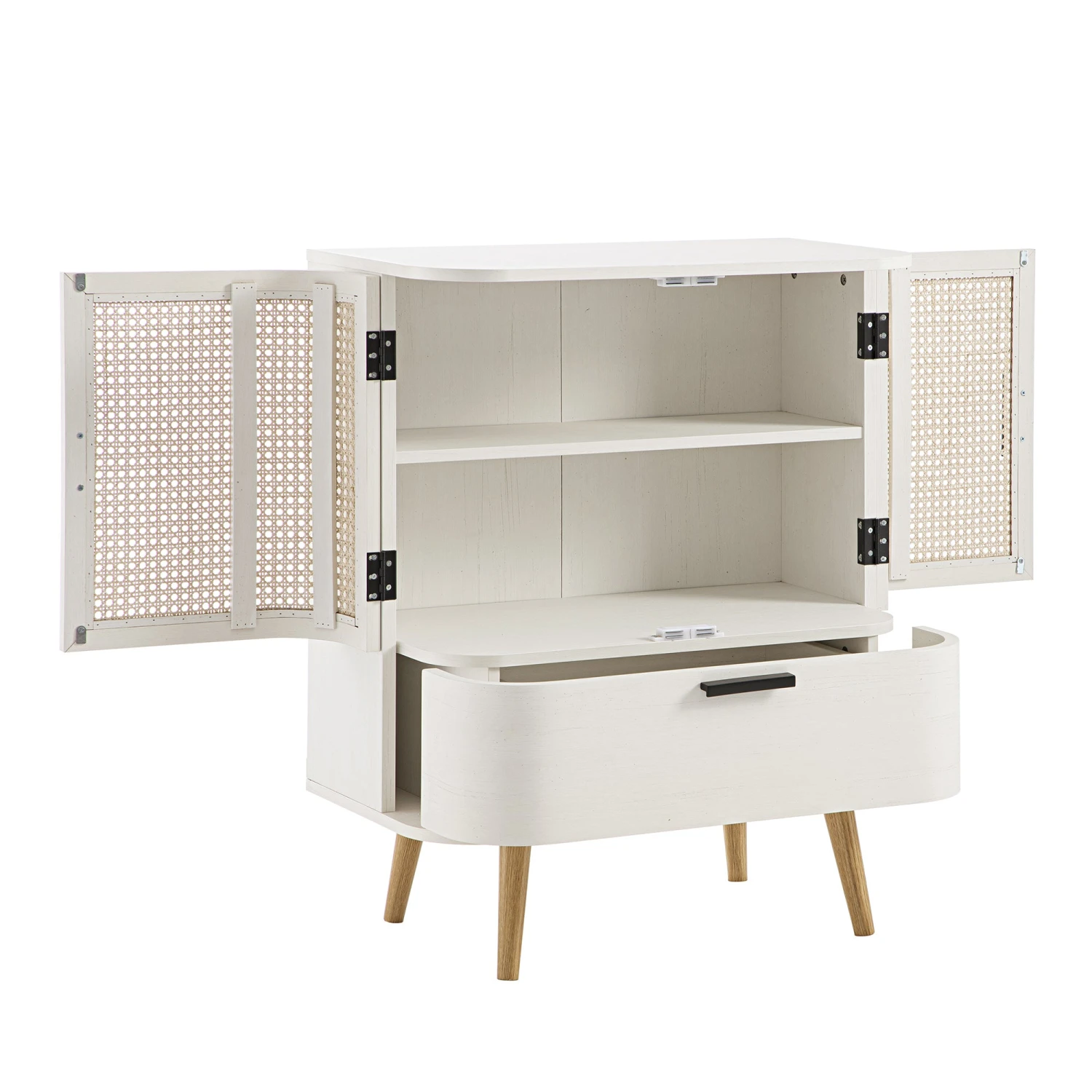 - Inside, two practical shelves are perfect for tableware, books, or everyday essentials, while the drawer below provides additional hidden storage.