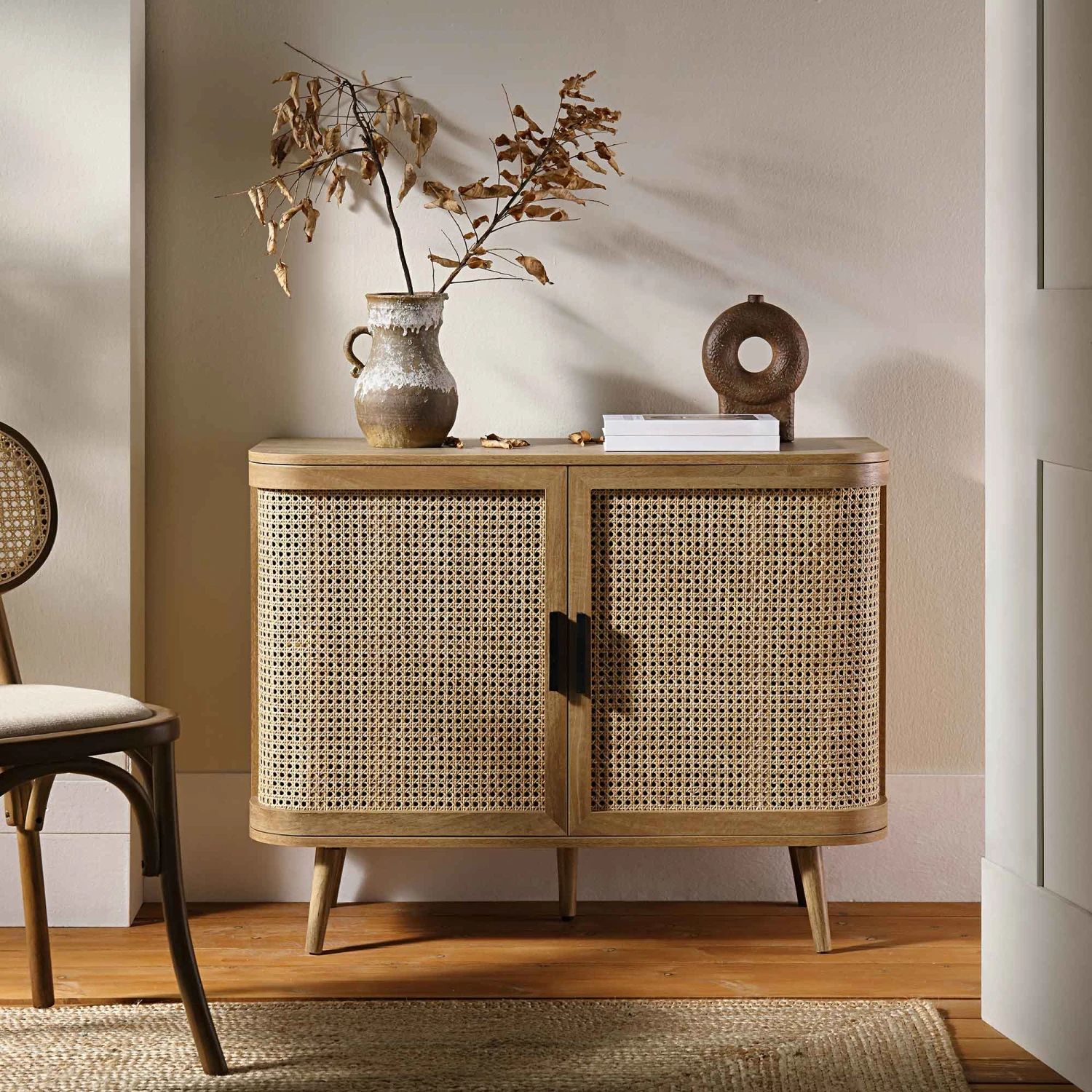 - Complete the look: Pictured with our Izzy Curved Rattan 2-Door Small Sideboard is our Anya Rattan Dining Chair in Light Walnut