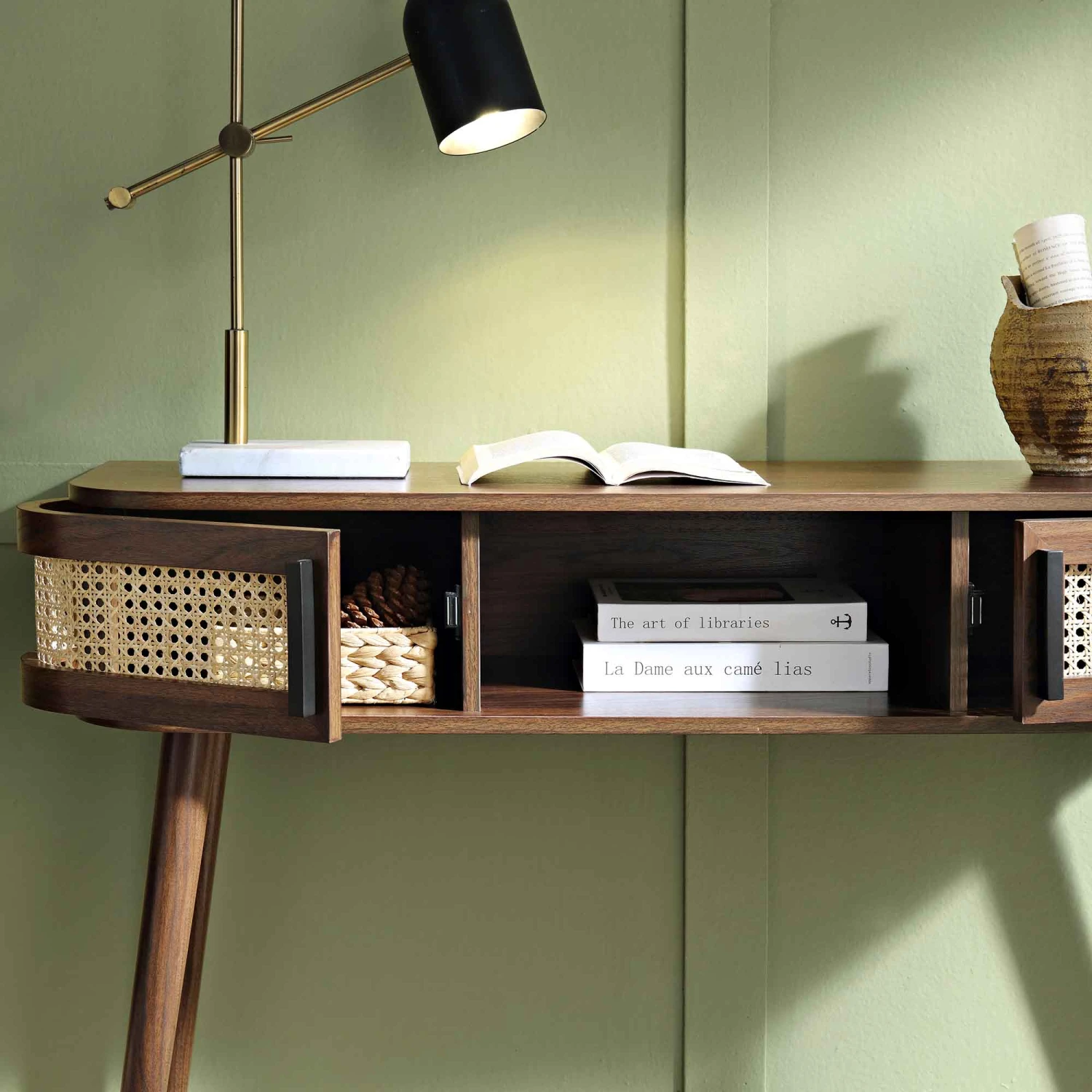 - Complete the look: Pictured with our Izzy Curved Rattan 2-Door Table is our Ophelia Moss Green Velvet Chair.