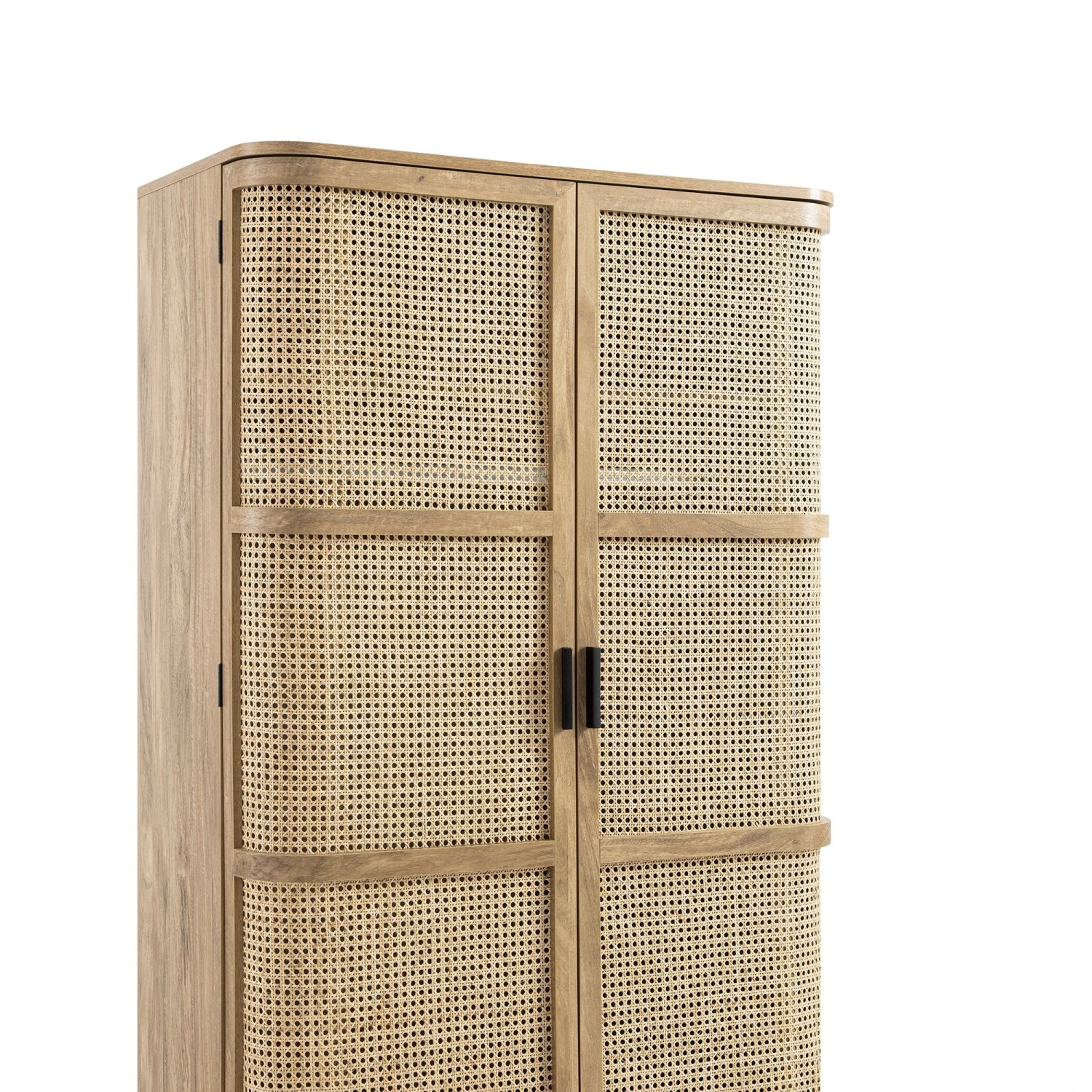 - Featuring a warm, natural wood-effect finish and framed by softly sculpted curves, this wardrobe features airy handwoven rattan panels that bring texture and lightness to the design.