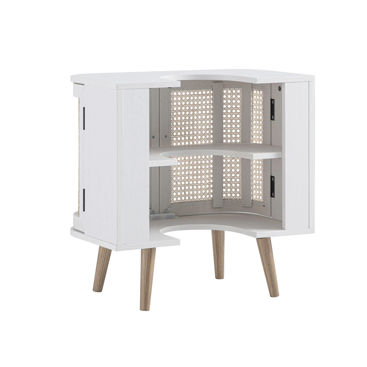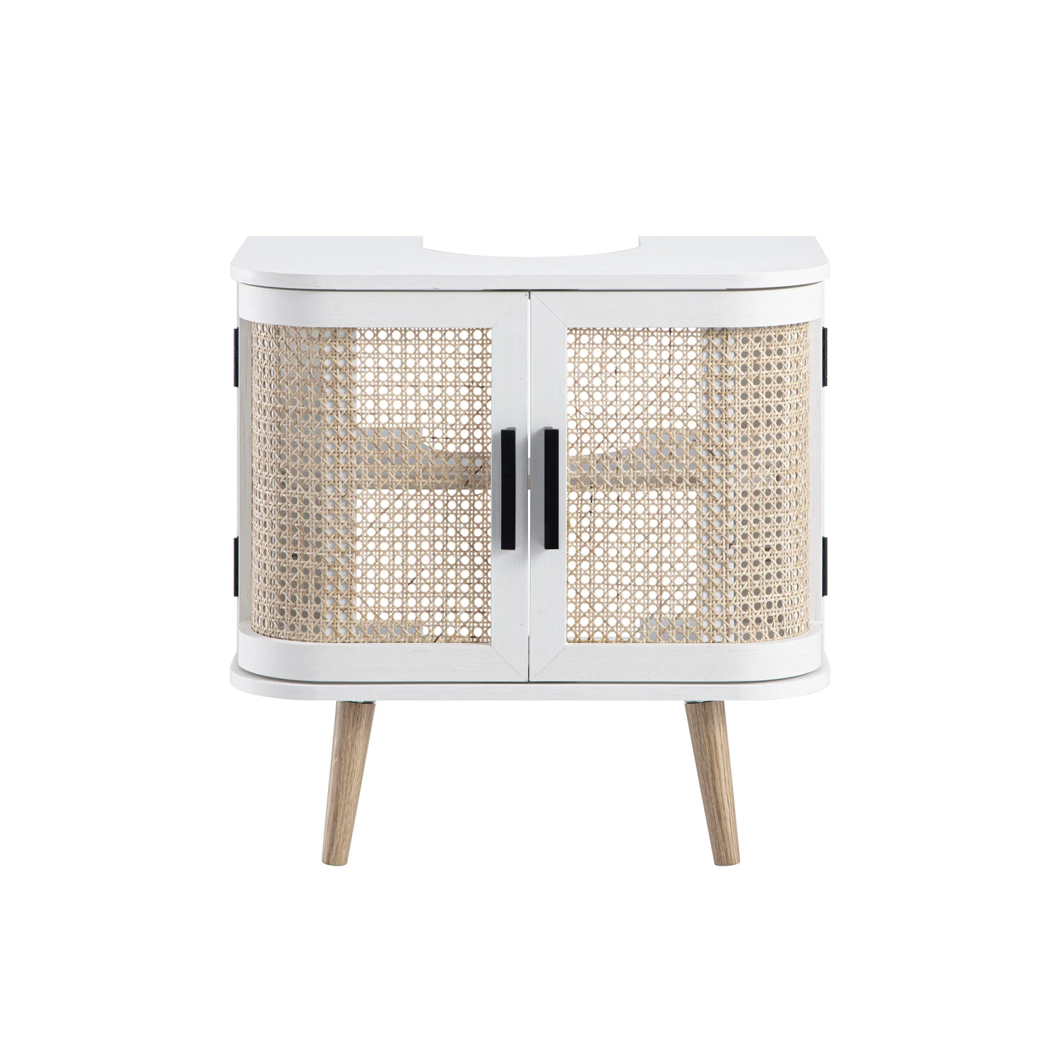 - Finished in a crisp white tone with a lightly distressed effect and detailed with handwoven rattan doors, it offers the perfect balance of style and practicality.