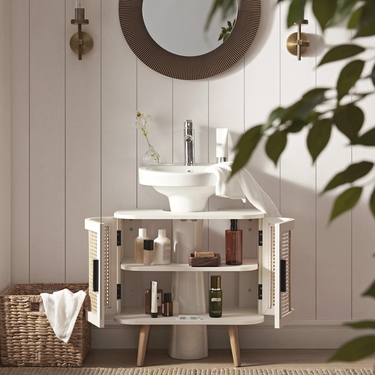 - Fresh, airy, and full of texture, our Izzy Curved Rattan Undersink Unit in White brings a relaxed elegance to your bathroom.