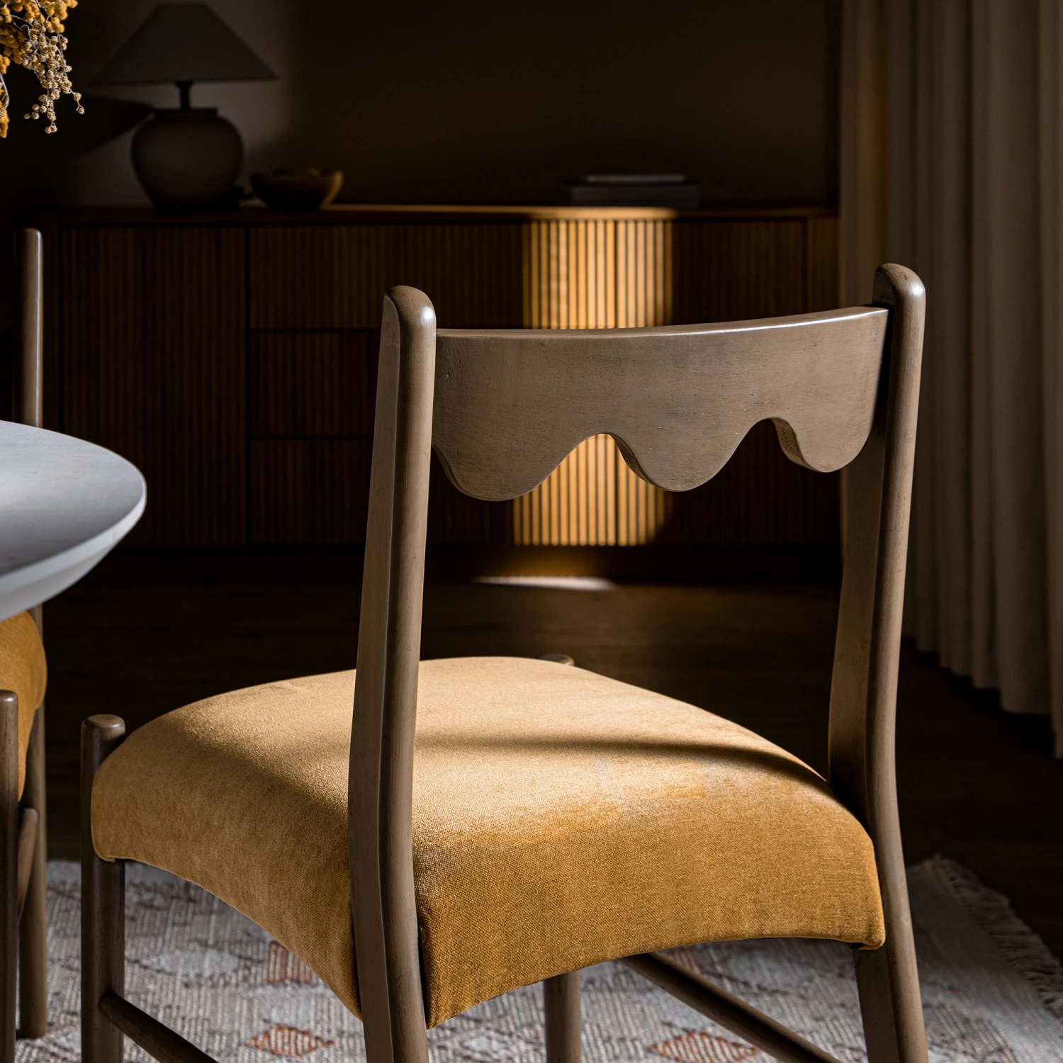 - A warm twist on a sculptural classic, the Ludlow dining chair in beautiful mustard tone chenille fabric brings richness and charm to your space.