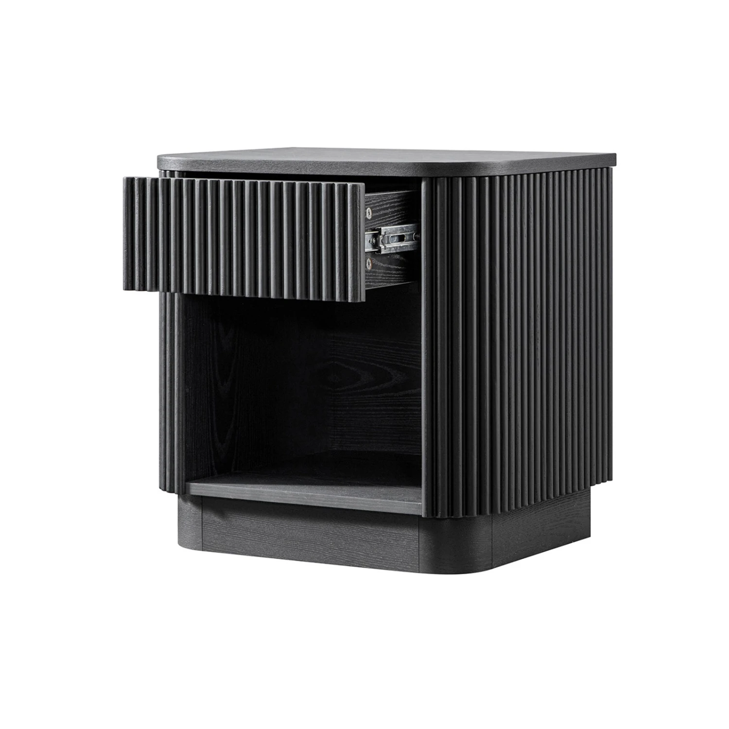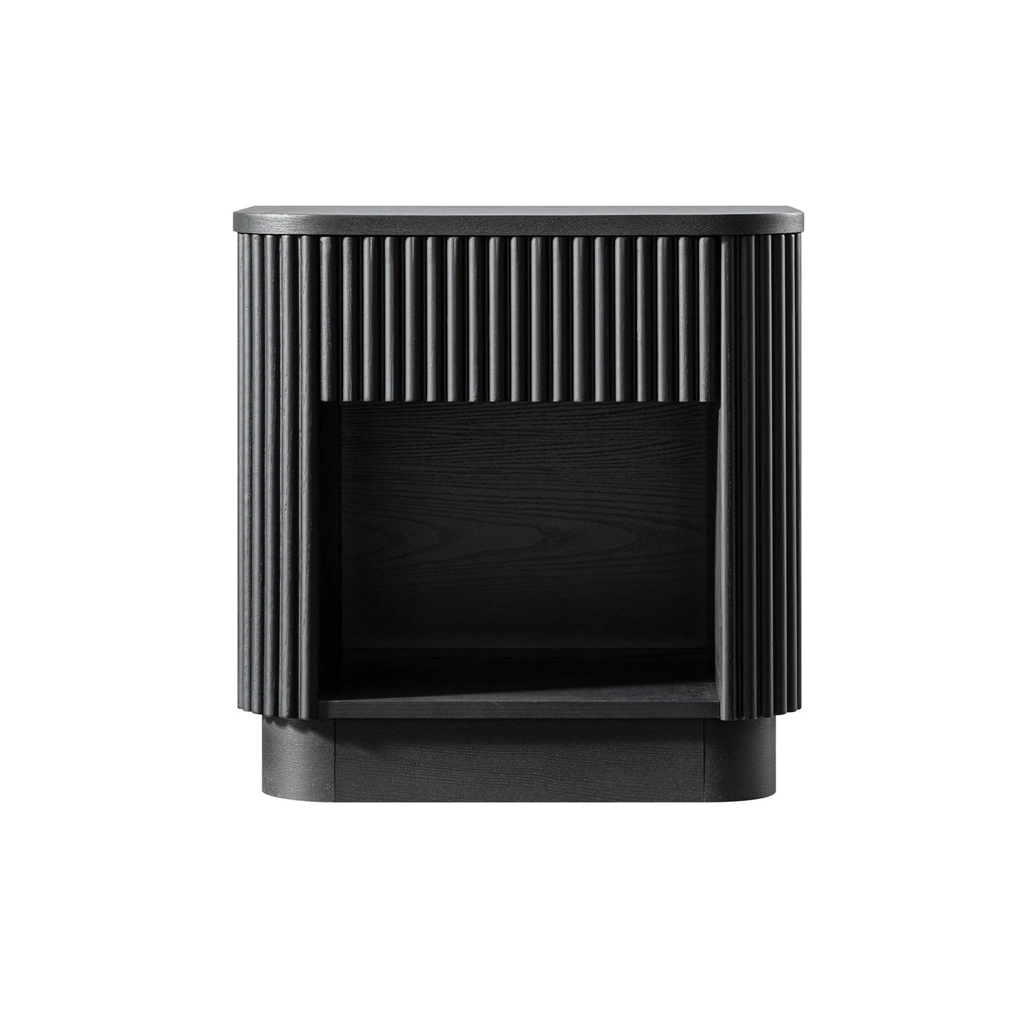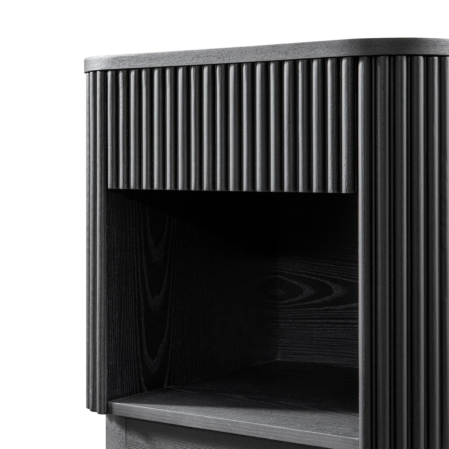 - The bedside table features all solid oak flutes on 3 vertical surfaces, including the front and both sides, for a striking and balanced look.