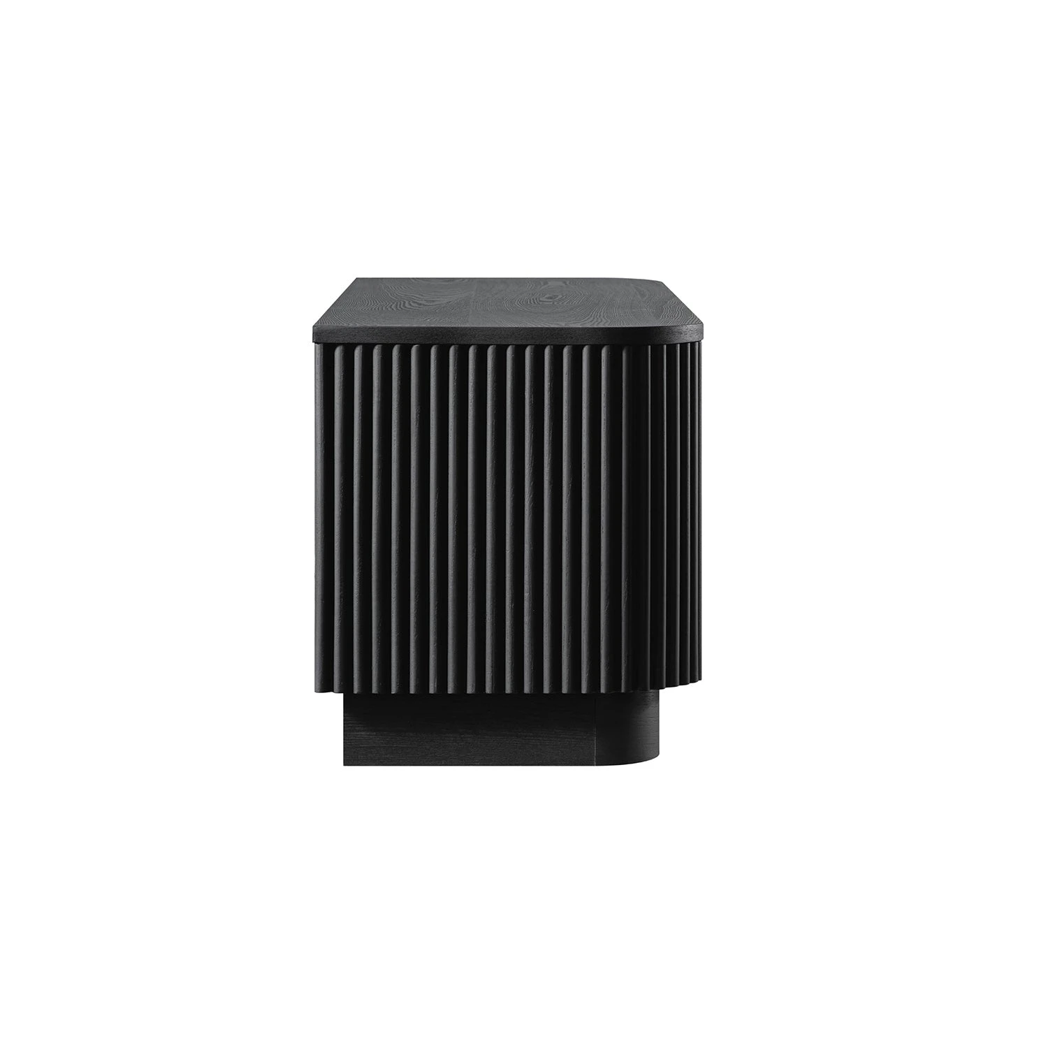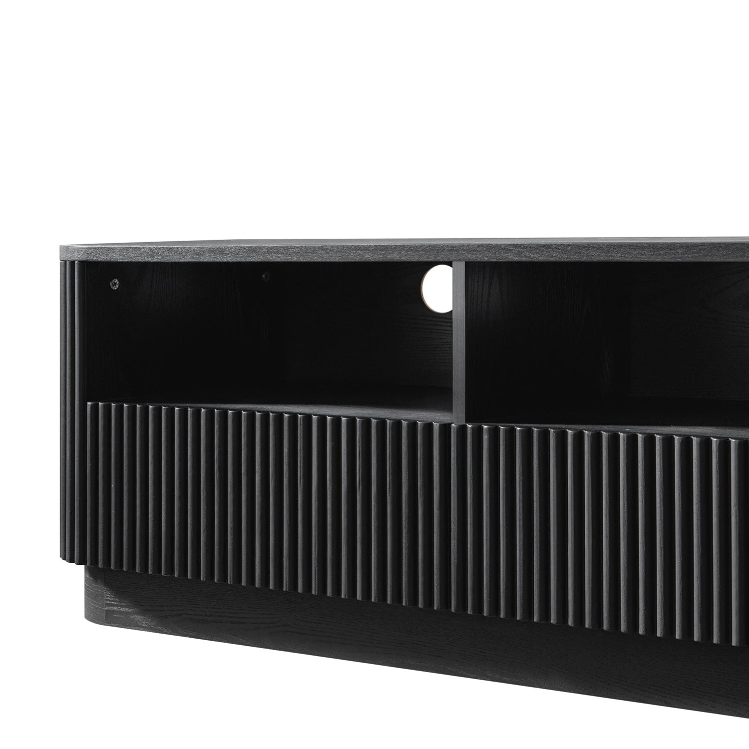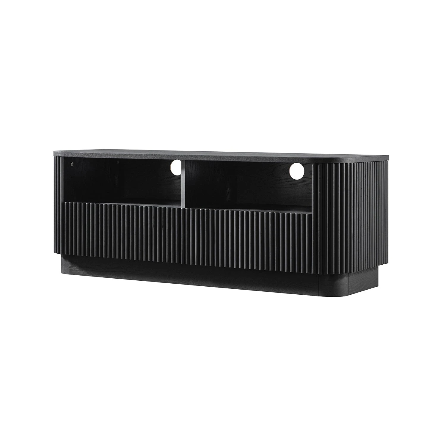 - Defined by its sculptural curves and fluted texture, this compact media unit brings together functional storage with sleek, architectural lines.