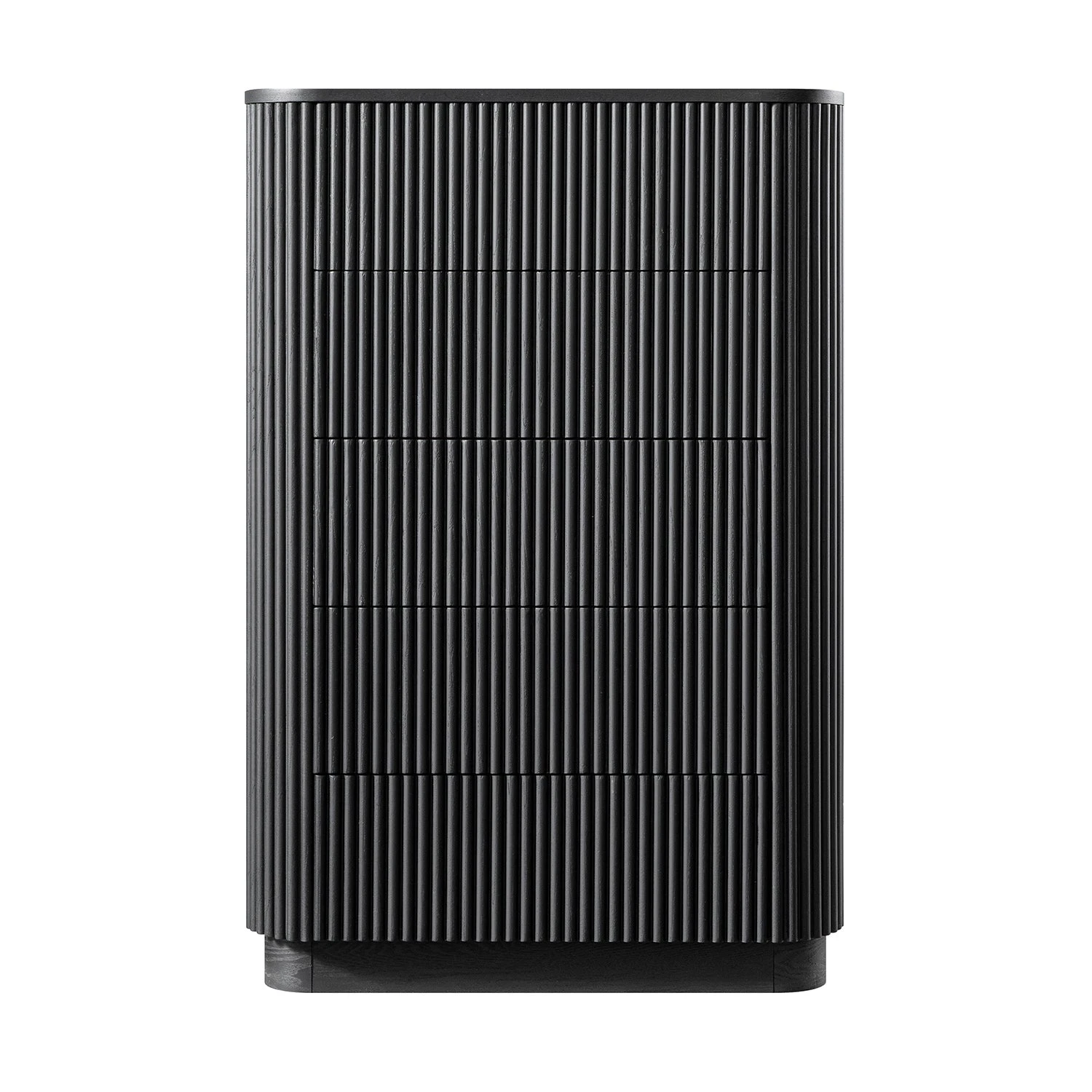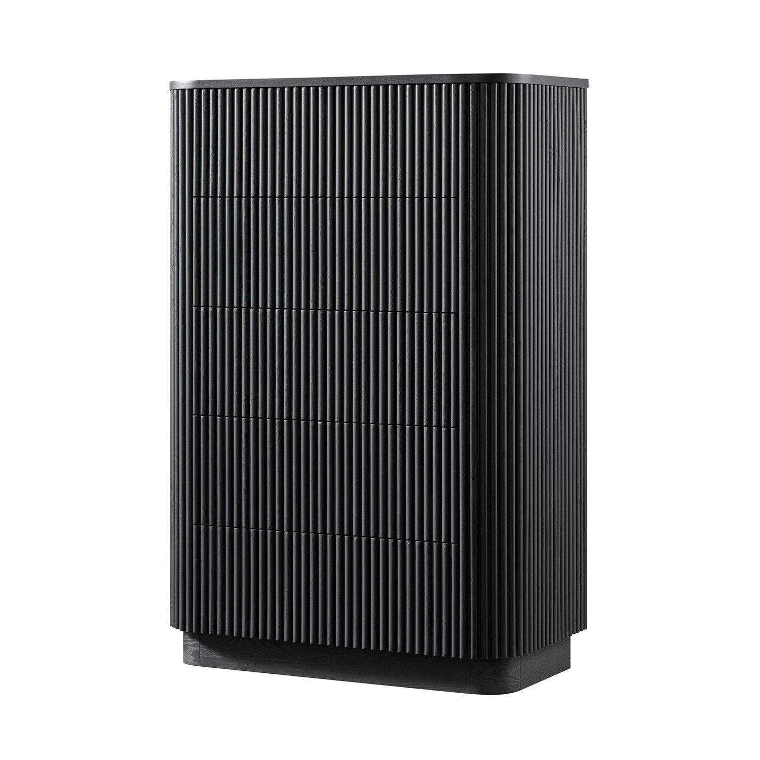- With its fluted ash veneer front and sculptural, softly rounded frame, our Maru tall drawer of 5 chests delivers practical storage in a striking profile.