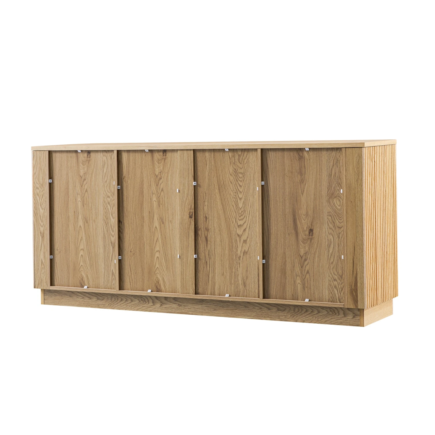 - Crafted with solid oak and veneer, its warm tone and natural grain are brought to life through continuous vertical fluting and softly curved edges.